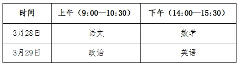 考试科目:语文、数学、政治、英语;考试分值:每科满分150分,总分600分,使用国家通用语言文字作答。