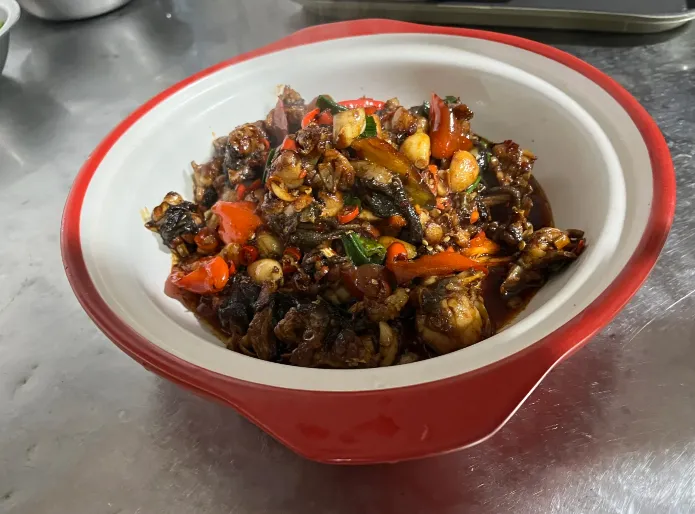推荐尝尝庐山石鸡:这菜讲究火候。选的是山涧里那种灰皮蛙,肉质紧实得像蒜瓣。做法通常是红烧,加点辣椒和蒜头爆炒,最后收汁。一口咬下去,不是那种软烂的口感,而是带着弹性的鲜甜,汤汁浓稠地挂在肉上,拌饭能吃三大碗。