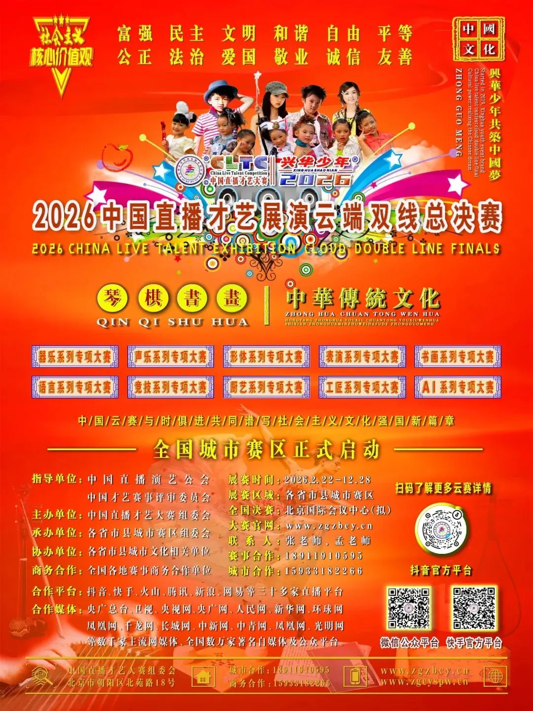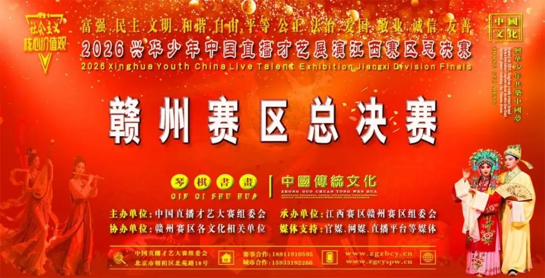 2026中国云赛展演活动以习近平新时代中国特色社会主义思想和深刻把握习近平文化思想为指导精神。全面贯彻落实中共中央、国务院印发的《新时代公民道德建设实施纲要》和《关于全面加强和改进新时代学校美育工作的意见》的通知精神,立足新时代人民群众思想特点和发展规律,在全社会大力培育和践行社会主义核心价值观,为促进赣州全市人民道德素质和文明素养不断提升。加强赣州优秀艺术人才队伍的建设,丰富赣州公共服务多元化,增强全市人民的文化自信获得感和幸福感,选拔和储备优秀文化艺术人才,不断推动全市公共文化服务。有中国直播才艺大赛组委会、华东赛区组委会、江西赛区组委会、赣州赛区组委会共同开展“2026兴华少年中国直播才艺展演云端双线总决赛”江西赣州赛区系列文化展演活动。