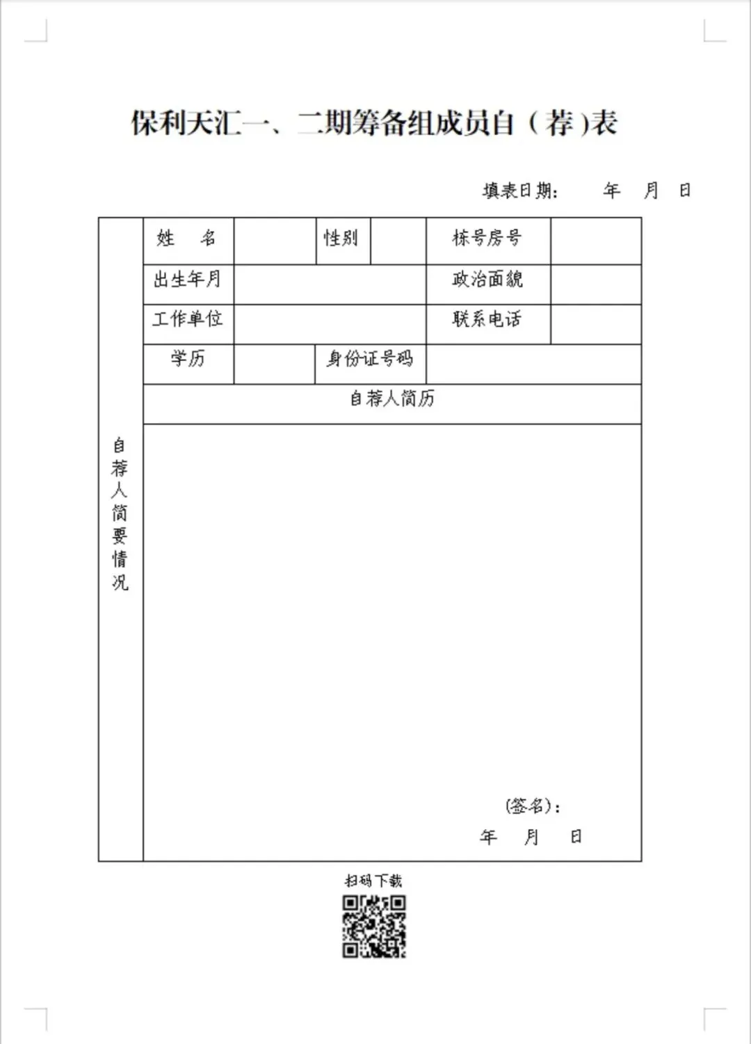 公告明确,报名时间为 2026 年 1 月 19 日至 1 月 25 日,业主需前往金坪路社区居委会提交材料,报名时需同步提供携带填写好的自荐表、本人身份证、户口本、房产证复印件及物业缴费证明、征信报告、无犯罪记录证明等相关资料递交给社区,党员需提供党员证明。