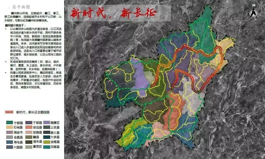 《赣州国家登山健身步道规划设计方案》在布局上充分结合我市全域旅游发展战略,总规划面积39379.64平方公里,共涉及18个县(市、区)和赣州经济技术开发区、赣州蓉江新区,并规划为“一个核心区,三条主干线”。