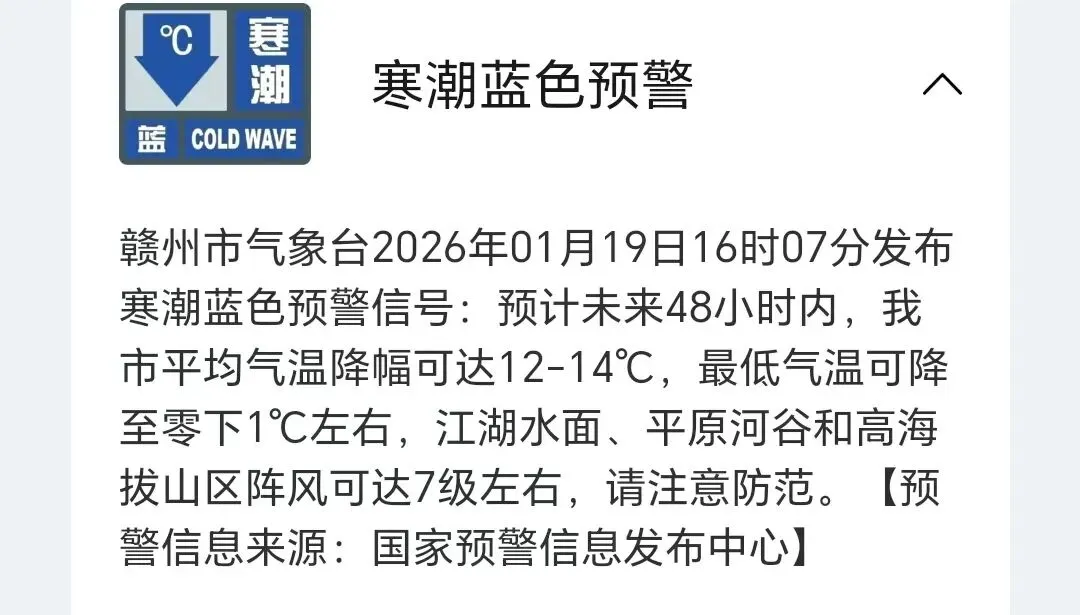 根据气象部门预报:预计受强寒潮影响,19日晚到22日全市有一次降温、大风、弱降水天气过程,平均气温降幅可达12~14℃,过程最低气温将降至零下1℃左右(出现在23日早晨),其间偏北风力加大到3~4级,江湖水面、平原河谷和高海拔山区阵风可达7级左右。