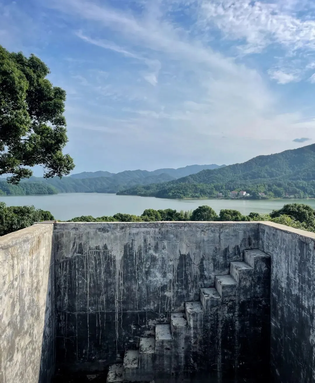 我们一行人乘坐的汽车沿着水库行驶。岸线很曲折,道路也并非与之贴合,所以偶尔可以看见水面,一晃而过。走了好一阵子,车辆转进一片田地,继续往前,路边逐渐成了滩涂,接着,就来到了一条水上的乡村公路,我们上岛了。