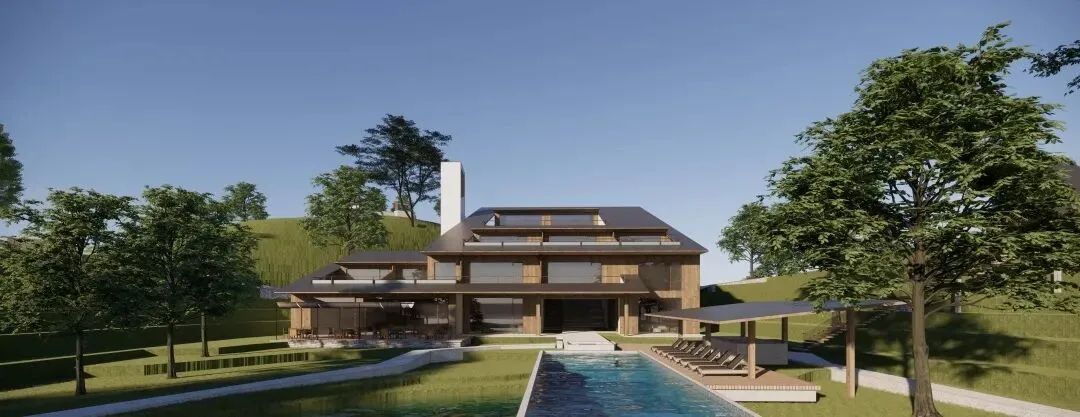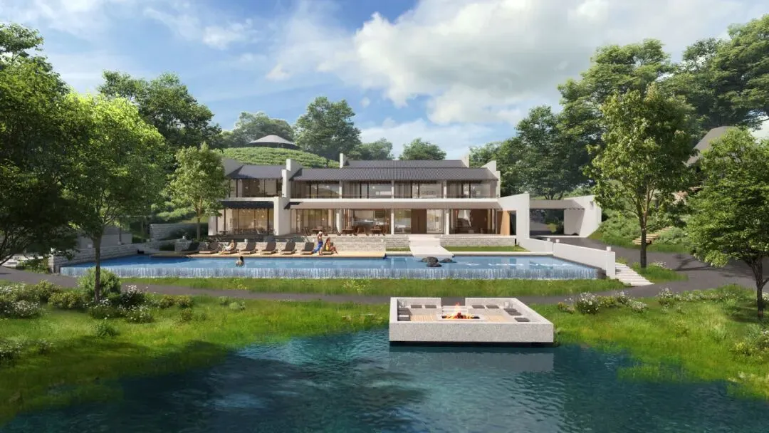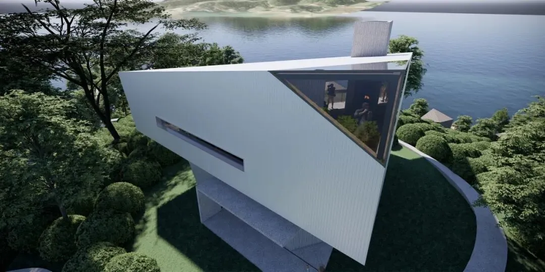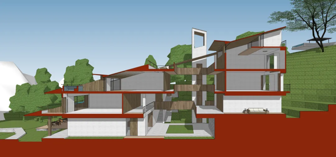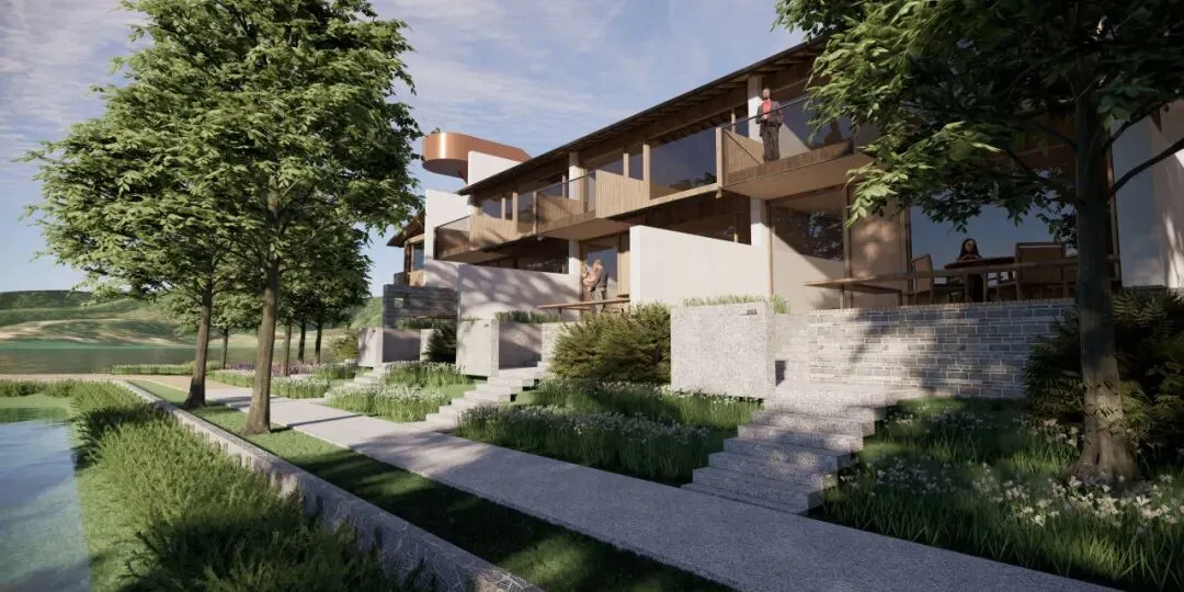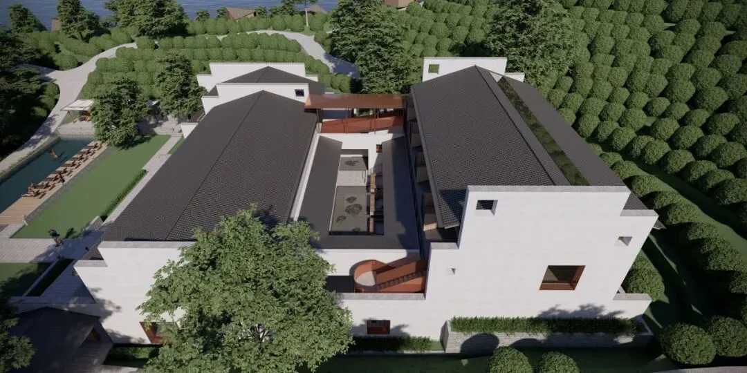 集中式的方案。由于山地地形南低北高,加之建筑占地有限,要保证客房数量,利用最好的视线,我们计划提升主楼地块的密度。为此,布置了大退台的空间方案,从南向北,逐渐升高,最大化南向的景观面,主楼客房达到17间,在20余间客房中,占据了绝对优势。原有建筑中间是个小庭院,这个空间特征被保留下来,另设计电梯到达上部客房,形成一组集约化成都较高的主体建筑。靠水边的配楼设计成3栋别墅套房,提升品质的同时也实现产品上的差异。