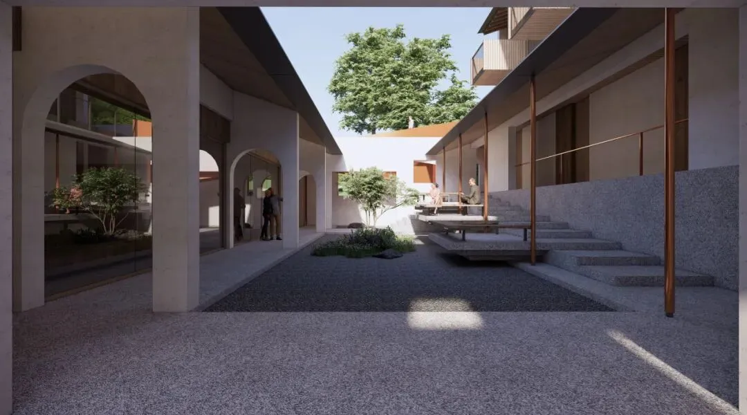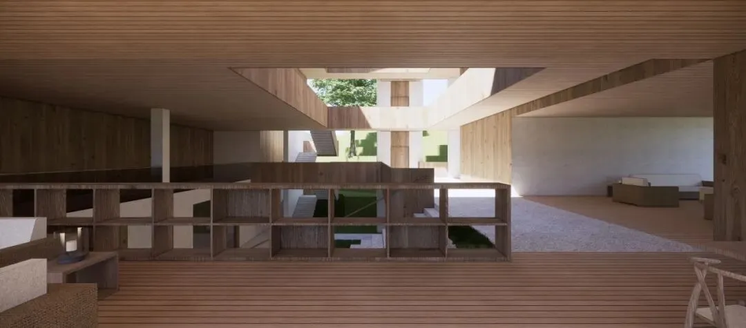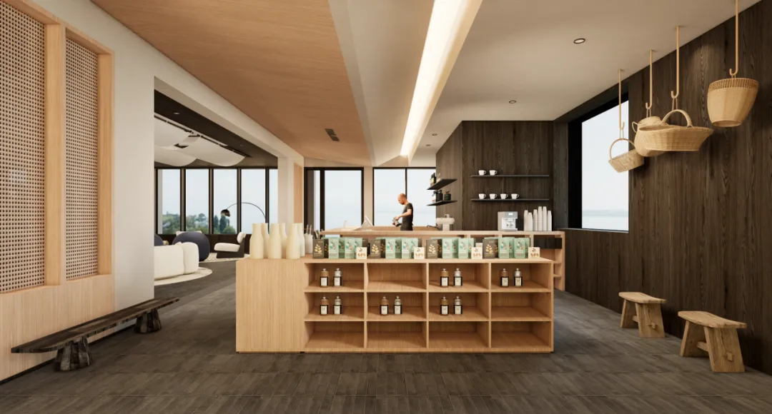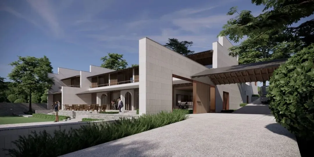在空间梳理完成后,立面上也以更现代的手法推进设计表达,使得原本传统的空间院落可以有更加外向的视觉效果。主楼增加了内部的坡道和楼梯跳色,配楼增加了亲水观景台可以一览周边的风景。整组建筑群体在保留现场茶园风貌的基础上,更加具有时代感和表现力。