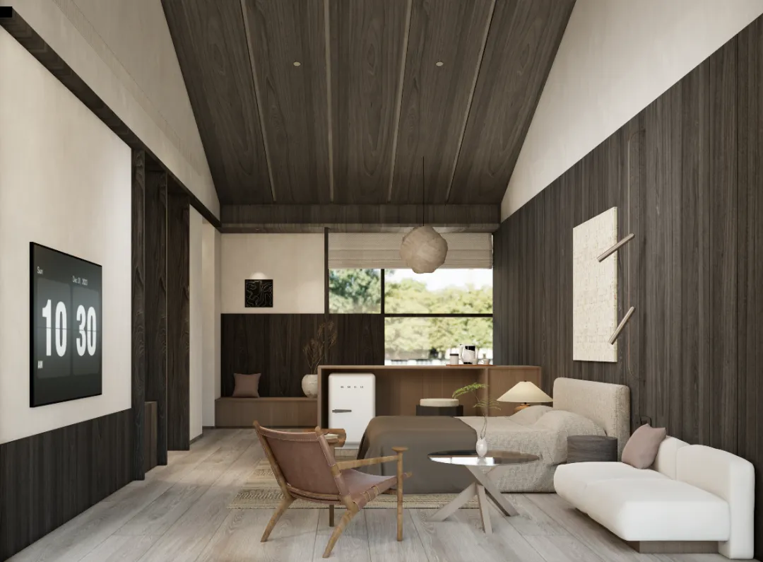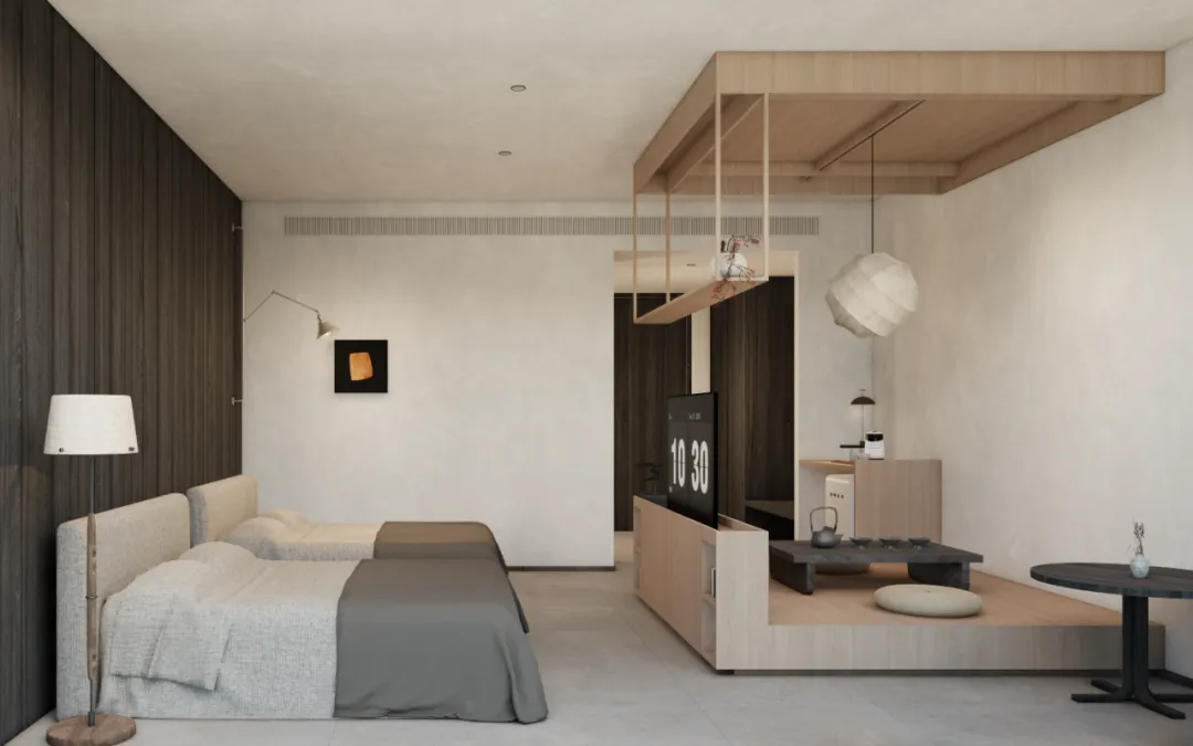 客房A:面向茶园的底层客房,面宽5.4米,在双床对面设计茶室,算是对茶园的回应。看着屋外的茶园,品尝自产的茶叶,也是一种特别的文化体验。茶室的隔断也成为卧房电视的背景,这是双大床的设计,可以满足家庭的出行要求。