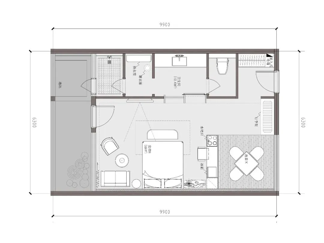 客房B:南向景观面的套房,面宽6.3米,卫生间也可以占据一段采光面,最前端设计室外泡池,与南向水景完美结合。茶室设计在入口处,作为房间的前厅,也使客房具备了套房的居住体验。
