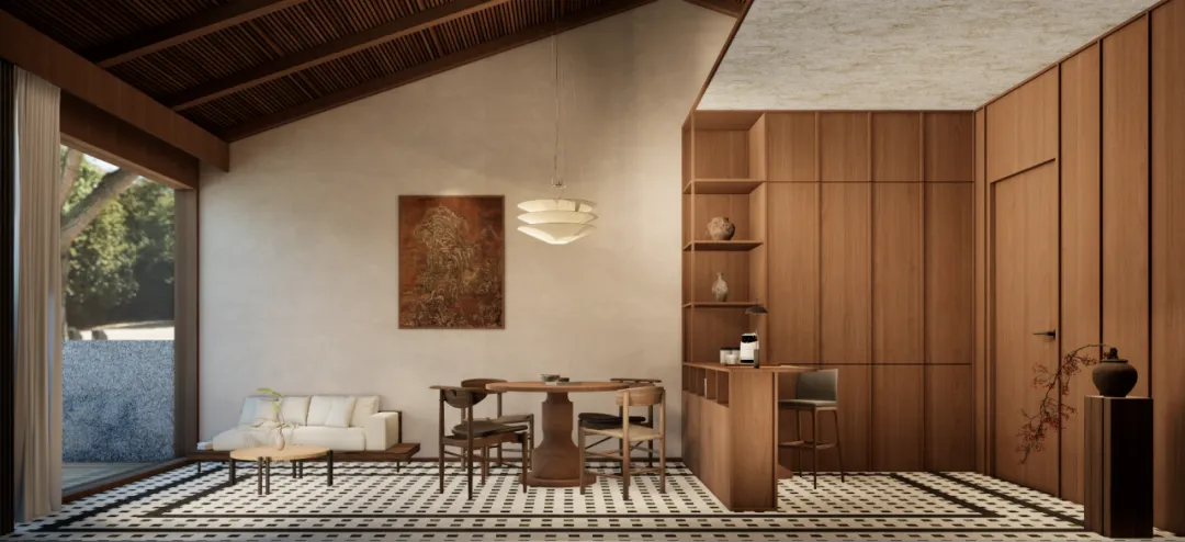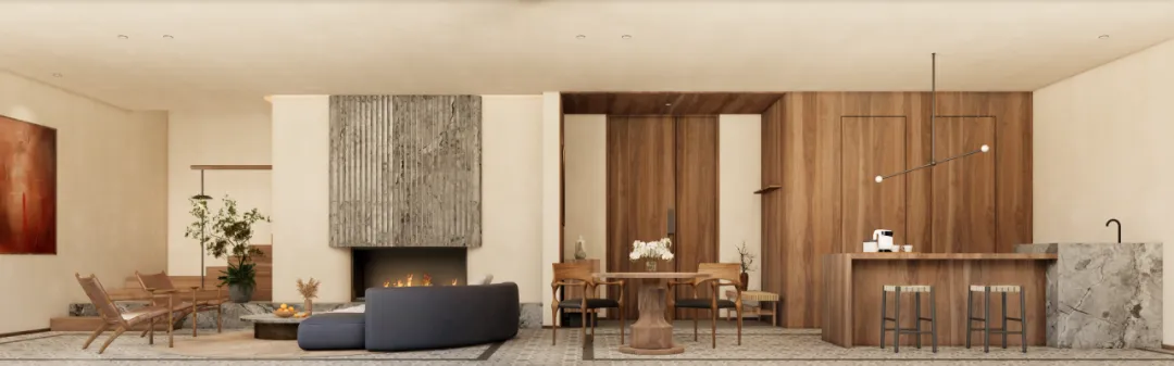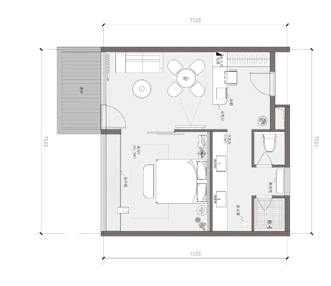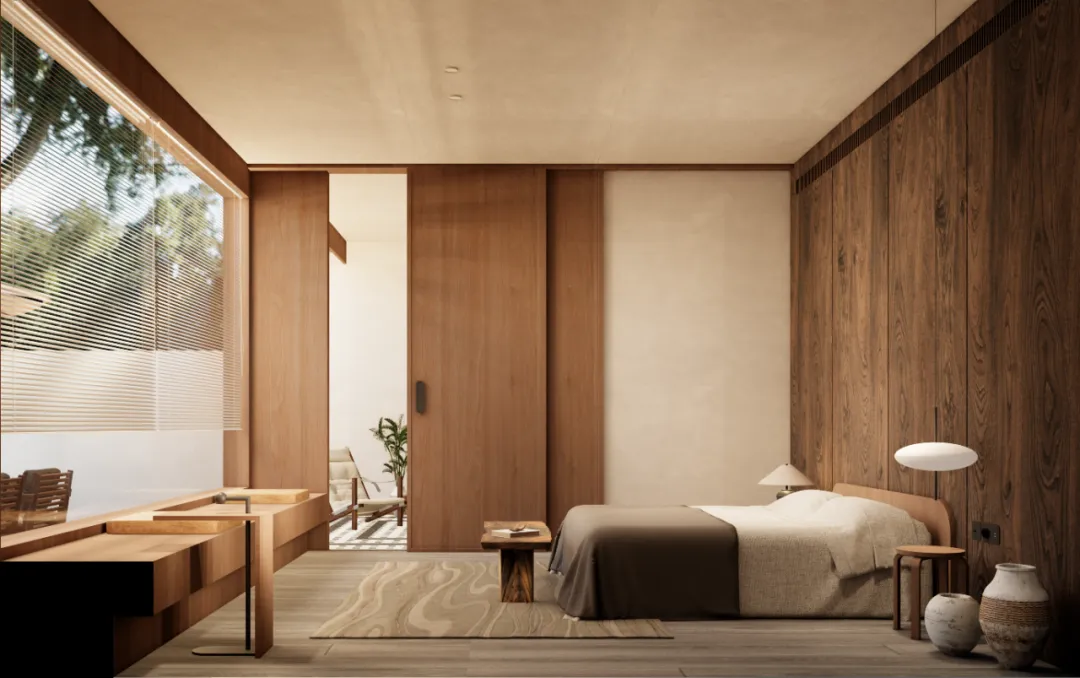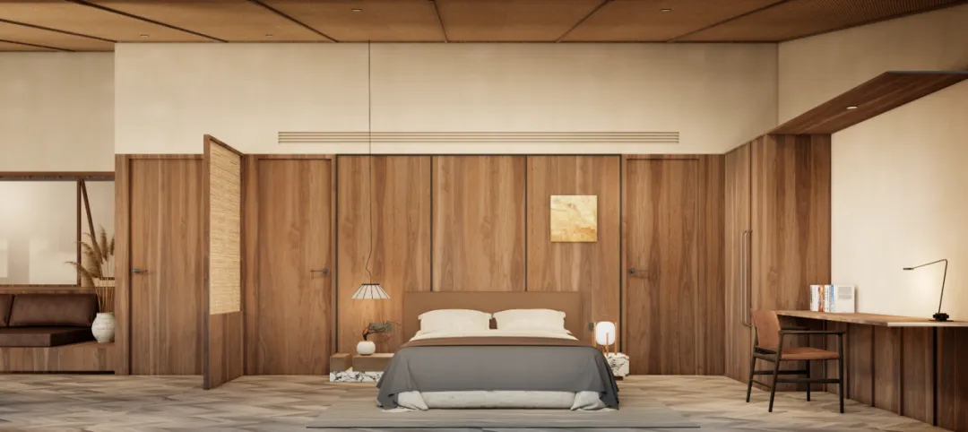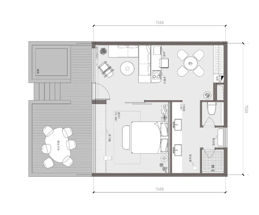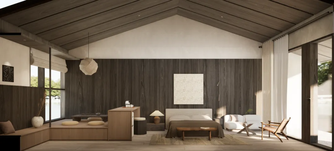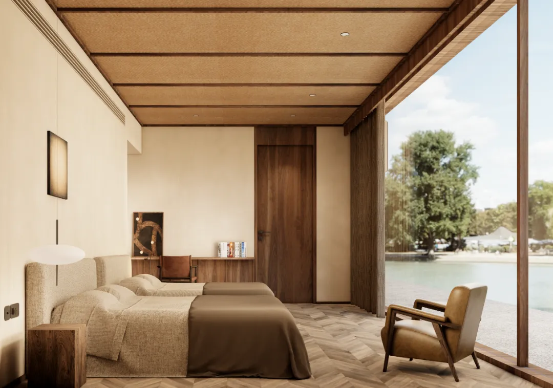 客房D:配楼的一层客房,从亲水庭院进入,经过室外亲水露台,进入客房内部。客房的总面宽增加到7.5米,客厅和卧室共享开间资源,客厅后侧为活动区,可以布置小餐桌或者棋牌区。卧室后侧则为卫生间,整个套房的尺度叫主楼更加宽松和舒适。