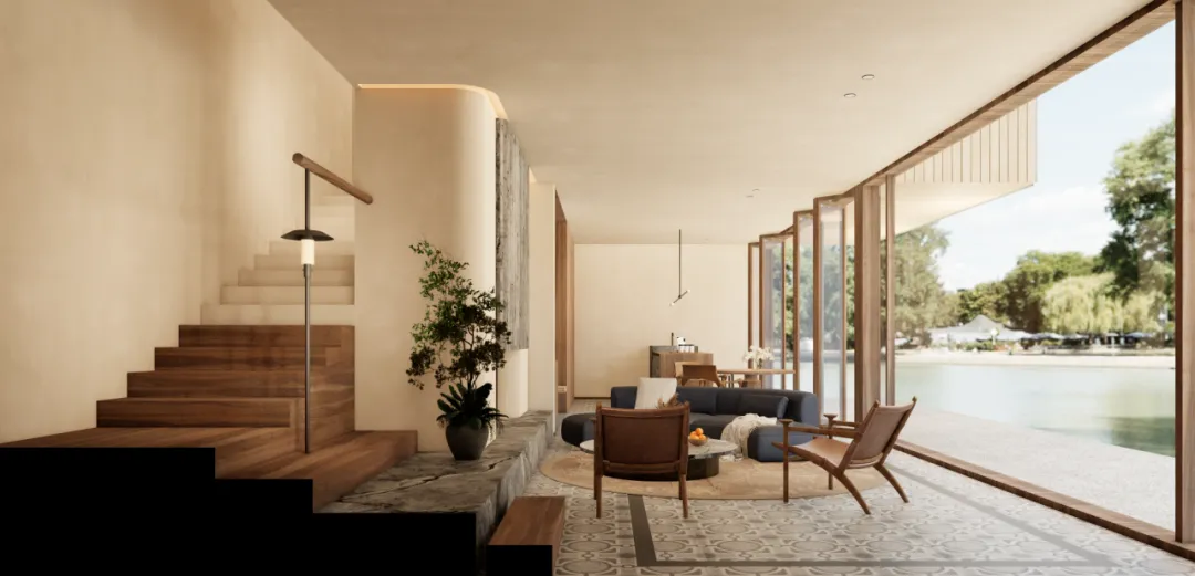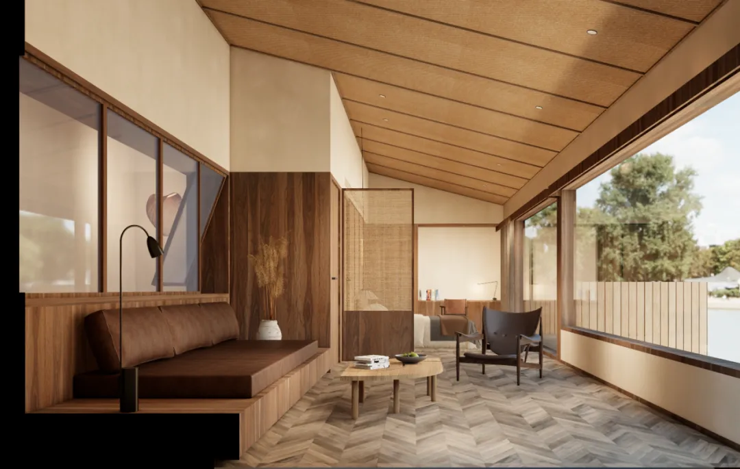 客房E:配楼的二层客房,从茶山一侧进入,与底层客房有不同的进入方式,相对独立。先进入小的行李玄关,再到达小客厅,体验更加合理高效。同样,面向水面布置有阳台,与楼下露台错位,形成不同风格的套房空间。
