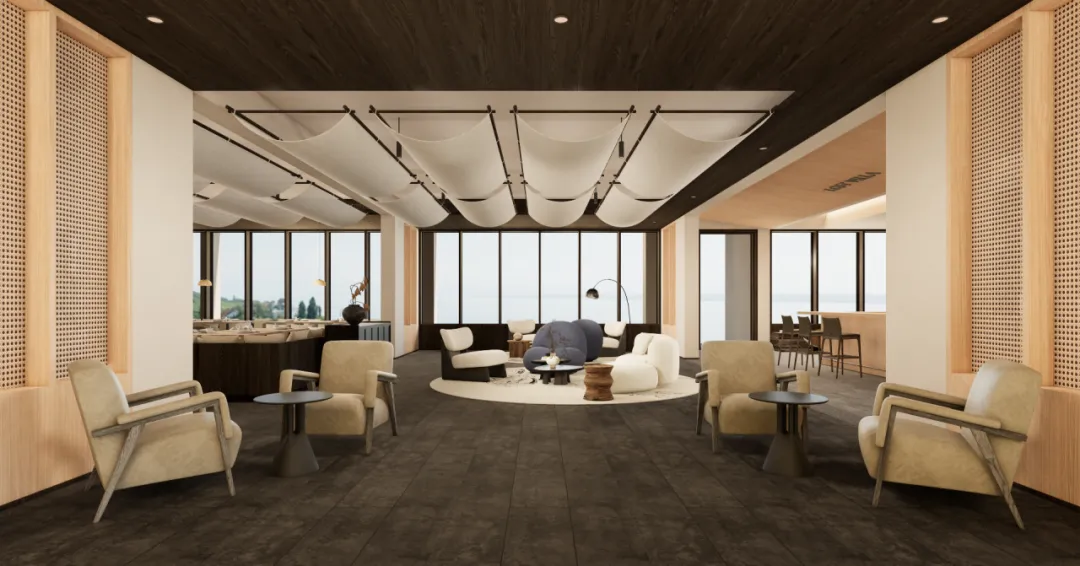 在接手深化后,首先梳理了客房要求,在原本北向的客房增加复式的活动区,增加南向阳台,实现南北双向的景观,增加核心景观的利用。南向客房增减了面宽,减少的间数,提升品质。配楼客房面向水面的一侧增加别墅套房,结合泳池形成独立的度假空间。