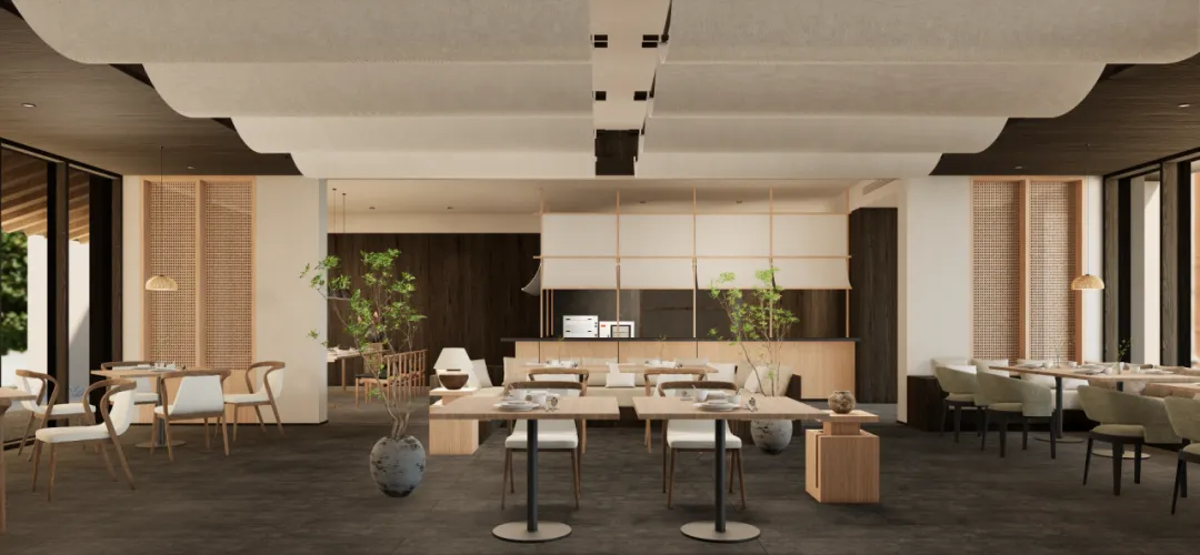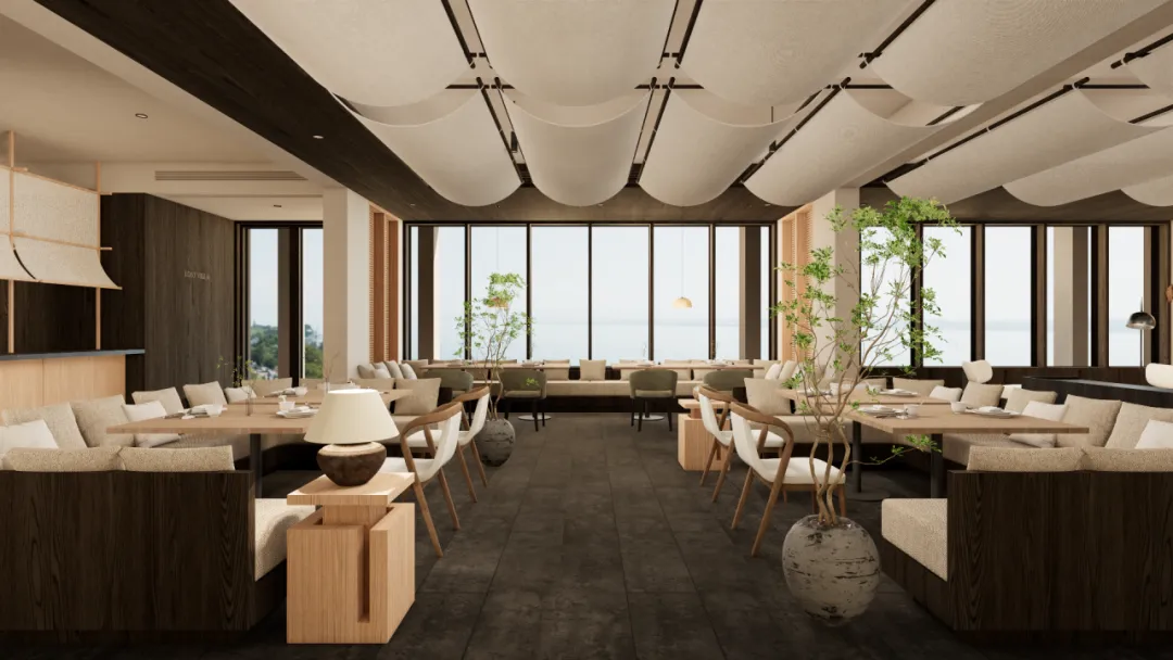 最大的公区是主楼的一楼,南向景观面全南向打开,自东向西,分别是接待前台、休憩区、餐厅、明档和小包厢。天花采用了较多的弧线设计,或硬质吊顶或软布构造,在丰富空间体验的同时,增加了空间的层次。这也是在项目中的一次创新的尝试。另外,在山脊上布置了独立的景观咖啡厅,在主楼南面安排了泳池和草坪活动区。