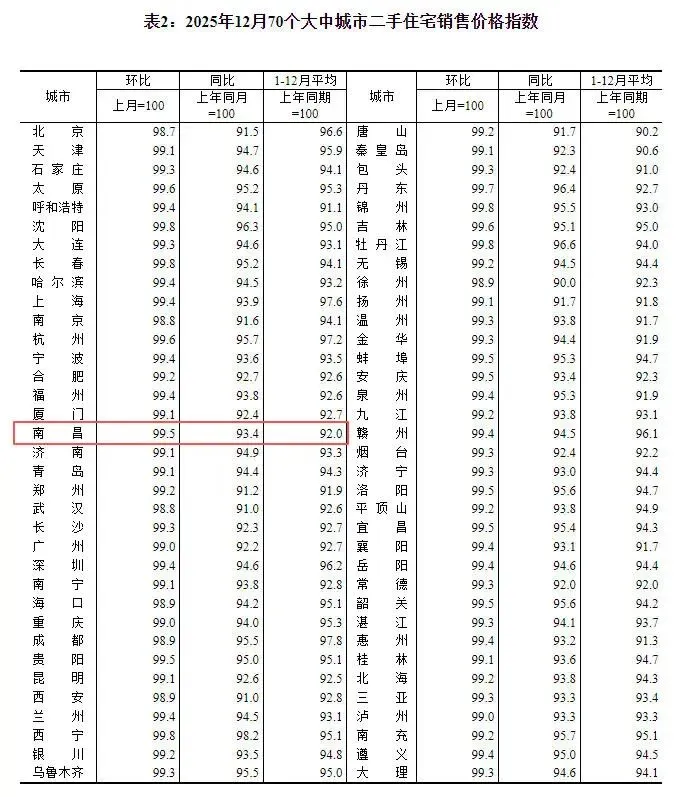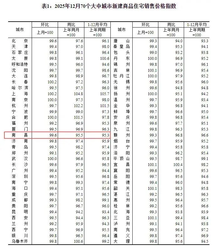 根据国家统计局发布的《2025年12月份70个大中城市商品住宅销售价格变动情况》,南昌12月新房价格环比下降0.4%,同比下降4.5%。