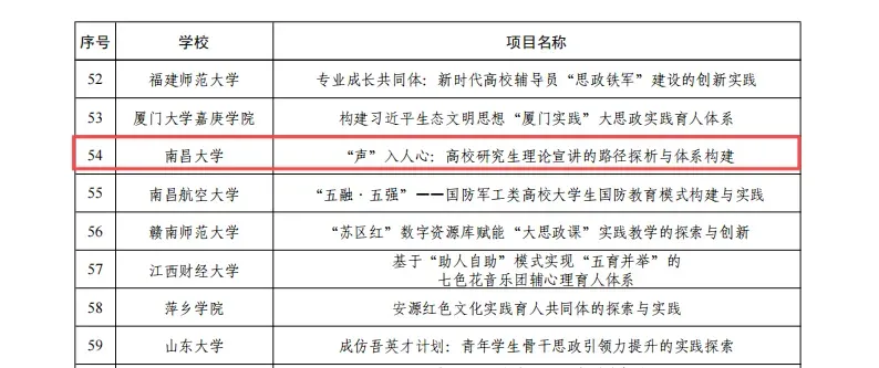 3月,教育部公示了2025年度高校思想政治工作质量提升综合改革与精品建设项目遴选结果。南昌大学理论武装精品项目《“声”入人心:高校研究生理论宣讲的路径探析与体系构建》入选2025年度高校思想政治工作精品项目名单。学校入选2025年度全国高校示范“一站式”学生社区名单。