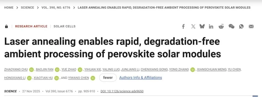 11月,我校化学化工学院/高分子及能源化学研究院陈义旺教授、胡笑添教授团队在新型薄膜太阳能电池领域取得重要突破,研究成果发表在国际顶级期刊Science上。