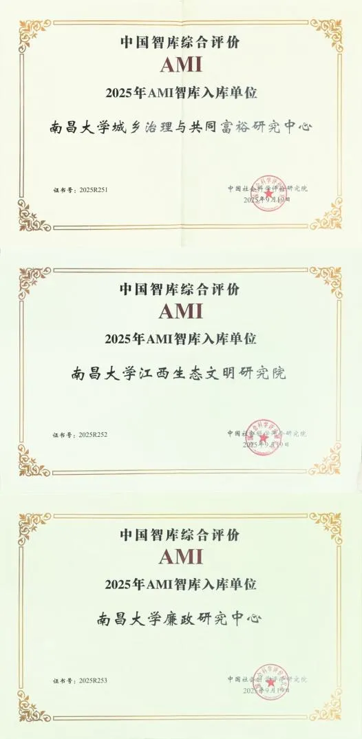 9月19日,在第八届中国智库建设与评价高峰论坛上,中国社会科学评价研究院正式公布“中国智库综合评价研究项目(2025)”AMI智库入库名单,南昌大学城乡治理与共同富裕研究中心、江西生态文明研究院、廉政研究中心荣登榜单。