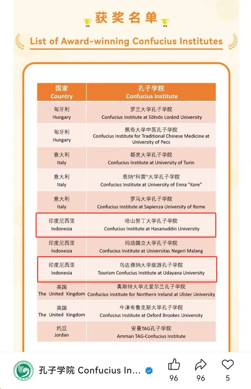 3月12日,中国国际中文教育基金会公布了“2024年度优秀通讯孔院”获奖名单,全球共有61所孔子学院入选。其中,我校印尼哈山努丁大学孔子学院与乌达雅纳大学旅游孔子学院双双登榜。