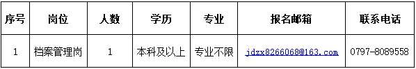 (2)报名方式:采用网上报名,报名材料以一个压缩包(命名为“应聘见习生岗位+姓名”)发送至指定报名邮箱jdzx8266068@163.com。每人限报一个岗位,报多个岗位的,取消报名资格。(3)报名材料:报名需提供以下材料:①《见习生招聘报名表》(下载附件,按要求填写,“贴照片”处插入近期免冠1寸照片);②身份证扫描件、毕业证书扫描件、学信网下载的本人《教育部学历证书电子注册备案表》或《中国高等教育学历认证报告》扫描件;③《就业失业证》扫描件(赣服通线上办理或者在常住地街道或乡镇进行登记办理);④要求中共党员的岗位需提供所在党支部出具的党组织关系证明扫描件或全国党员信息管理系统本人信息截图。(1)面试前对报名材料进行线上初审,初审通过后电话或短信通知现场面试,面试时需携带身份证、毕业证、党组织关系证明等材料原件。(2)面试主要考察逻辑思维、组织协调、语言表达、临场应变和解决实际问题的能力等,按面试成绩择优录用。拟录用对象接到通知后在规定的时间内完成岗前体检,办理相关手续后签订见习协议。无正当理由逾期又不能说明情况的取消录用资格。