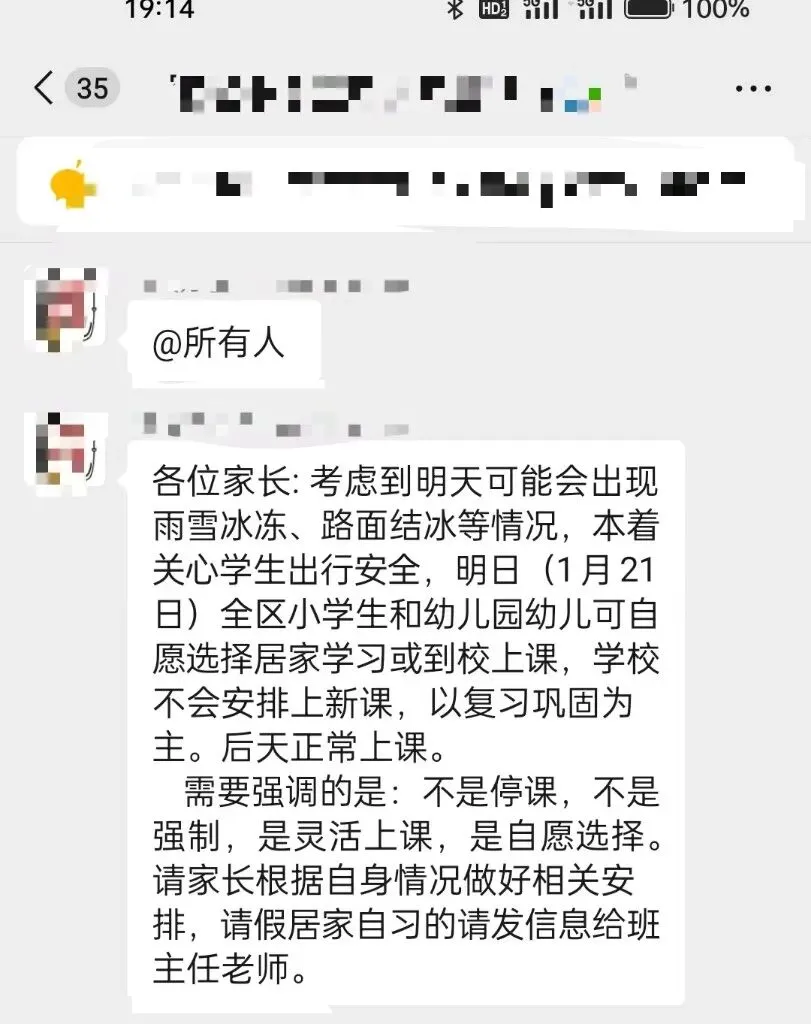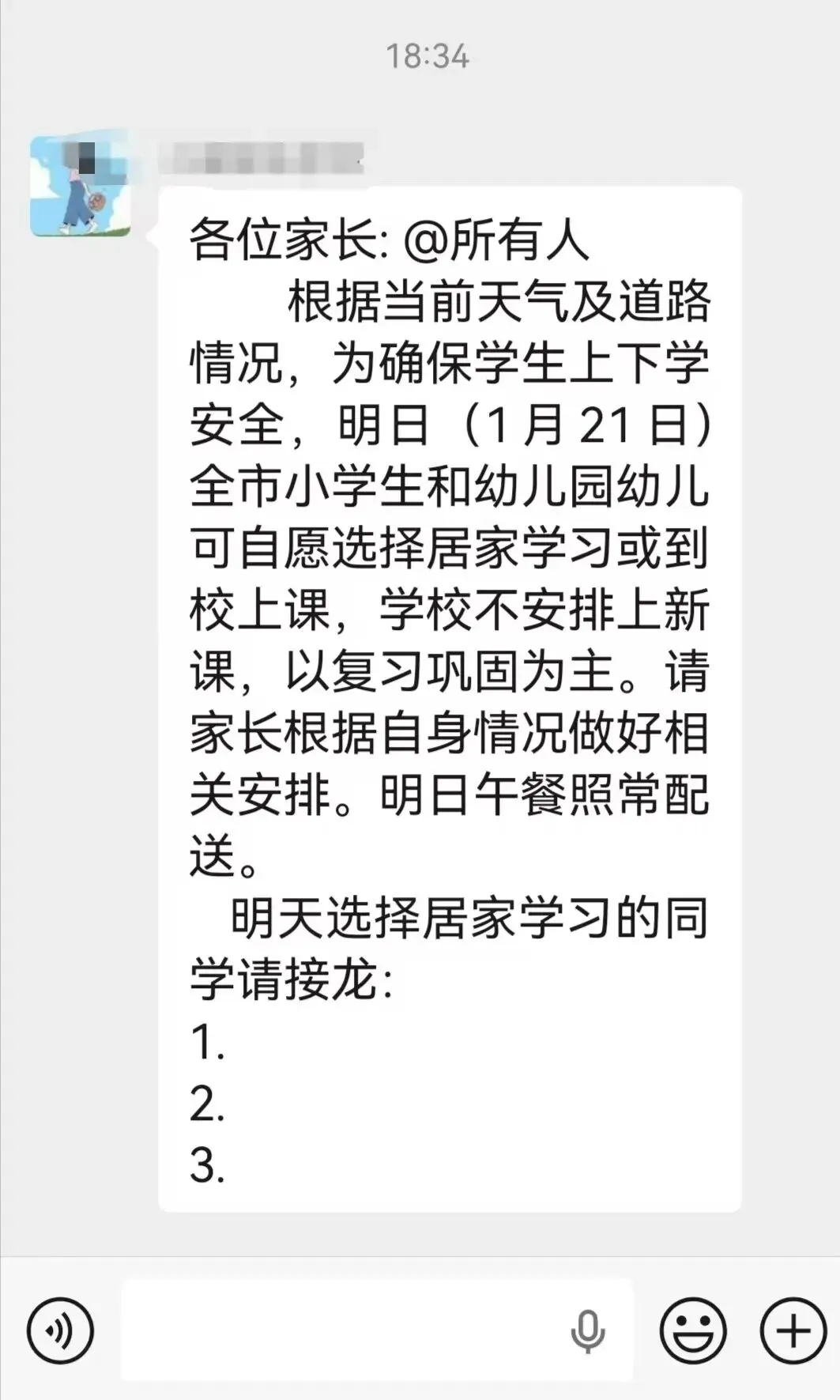 根据南昌多位家长提供的群信息显示,通知中还提到“我们建议孩子居家学习,避免因路面结冰、湿滑带来的出行风险。如您确有困难需要送孩子来校,请在小程序登记,以便我们做好安全保障准备。”“需要强调的是:不是停课,不是强制,是灵活上课,是自愿选择。请家长根据自身情况做好相关安排。”