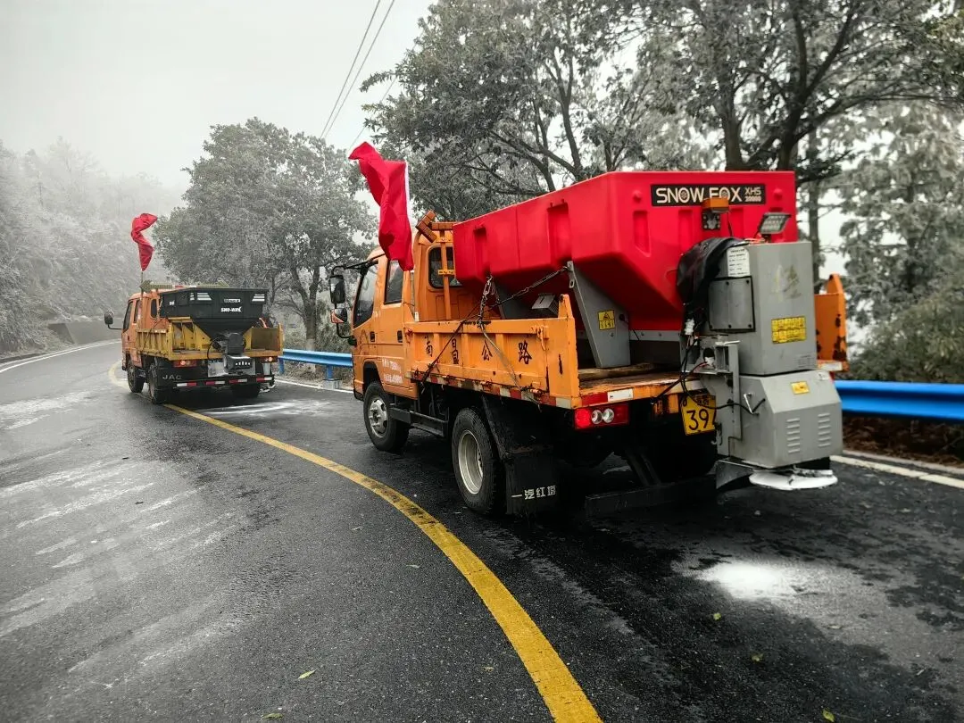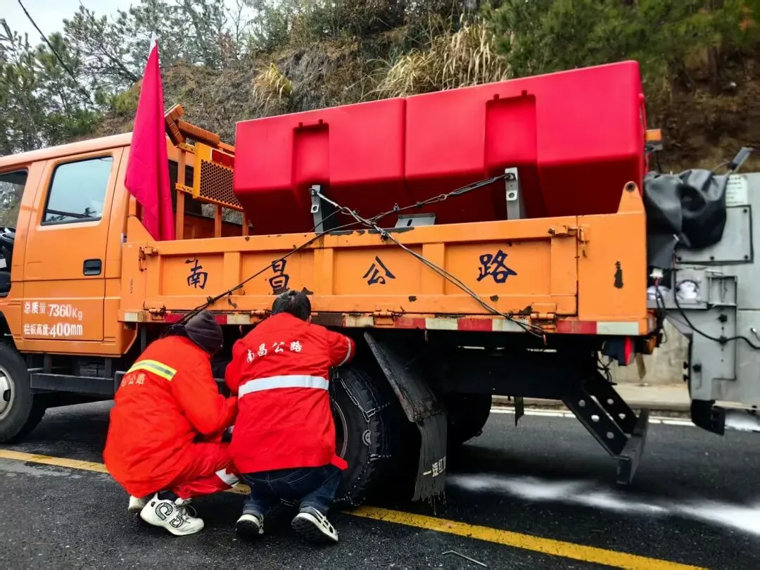 清晨8点,南昌湾里公路分中心24名应急抢险队员整装出发,调配路况巡查车2台、撒盐机2台、应急处置养护车5辆,携带融雪剂10余吨、草垫2000个及各类警示标志、安全设施,赶赴结冰严重的重点路段。