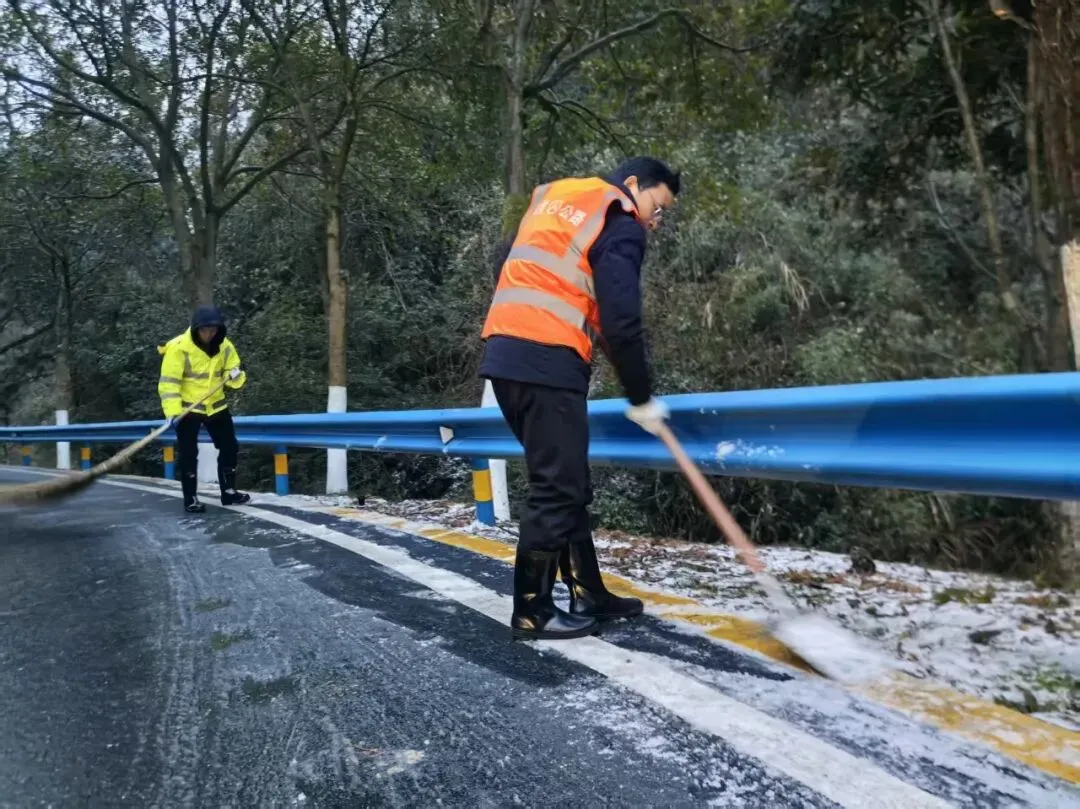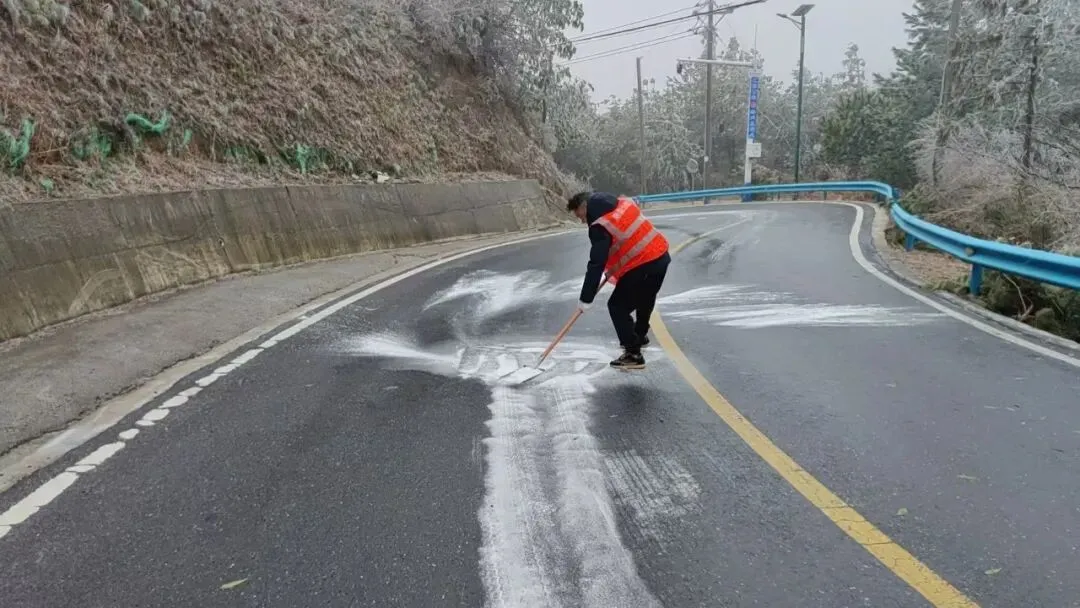 为应对冰冻路段,撒盐车已率先开道。应急队员们紧随其后,手持铁锹、扫帚,重点清理机械难以触及的盲区、桥面以及急弯陡坡上的残雪薄冰,不放过每一处安全隐患。