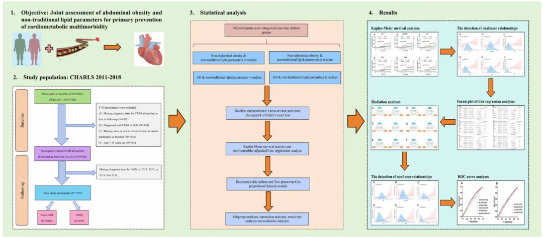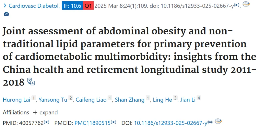 今天睿因生物给大家推荐的文章由南昌大学第二附属医院的学者用CHARLS数据库,在期刊《Cardiovasc Diabetol》(IF=10.6)的题为:“Joint assessment of abdominal obesity and non-traditional lipid parameters for primary prevention of cardiometabolic multimorbidity: insights from the China health and retirement longitudinal study 2011-2018”的研究论文。