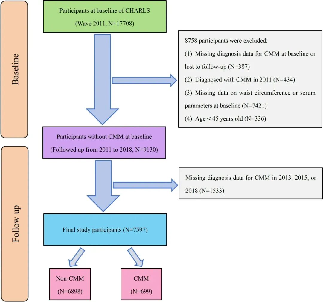 纳入 2011-2018 年 CHARLS 队列中 7597 名 45 岁及以上参与者,排除基线时已患 CMM、数据缺失或失访者,最终随访 7 年,记录新发 CMM 事件(糖尿病、心脏病、中风的组合发病)。