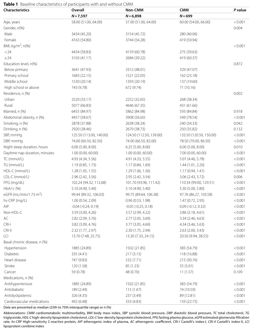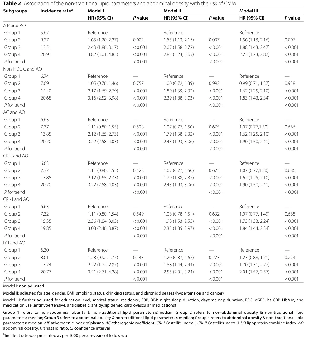 该研究基于 2011-2018 年 CHARLS 的 7597 名参与者(平均年龄 58 岁,男性占 45.20%),经最长 7 年随访,9.20% 的参与者新发 CMM。CMM 患者基线特征更倾向于年龄较大、女性、腹型肥胖、非吸烟、居住在城市,且慢性疾病(高血压、糖尿病等)患病率和相关药物使用率更高;同时,其收缩压、舒张压、白天午睡时长及多项血脂、血糖、炎症相关指标(TC、TG、FPG 等)显著更高,夜间睡眠时长、高密度脂蛋白胆固醇和估算肾小球滤过率显著更低(均 P<0.05)。联合评估时,腹型肥胖(AO)且非传统脂质参数高水平的个体,CMM 累计发病率最高;多变量调整后,该群体患 CMM 的风险也最高(以非腹型肥胖且非传统脂质参数低水平者为参照),其次是 AO 且非传统脂质参数低水平者,再是非腹型肥胖且非传统脂质参数高水平者。其中,AO 合并高 AIP 指数的个体 CMM 发病风险最高。