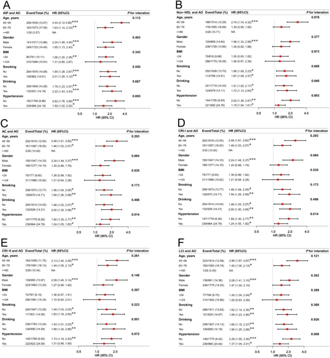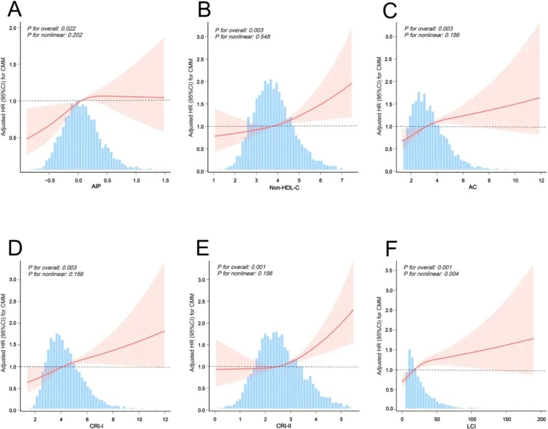 多变量调整 RCS 分析结果显示:有腹型肥胖(AO)的参与者中,AIP、非 HDL-C、AC、CRI-I、CRI-II 与 CMM 风险呈线性正相关,LCI 则呈非线性关系,其与 CMM 发病风险的拐点为 42.78,LCI<42.78 时风险随其升高而显著增加(HR=1.02),超过该值后关联无统计学意义;无 AO 的参与者中,AIP、AC、CRI-I、LCI 与 CMM 风险呈线性正相关,CRI-II 呈非线性关系,拐点为 4.06,拐点后 CRI-II 与 CMM 风险显著正相关(HR=2.07),拐点前关联无统计学意义。