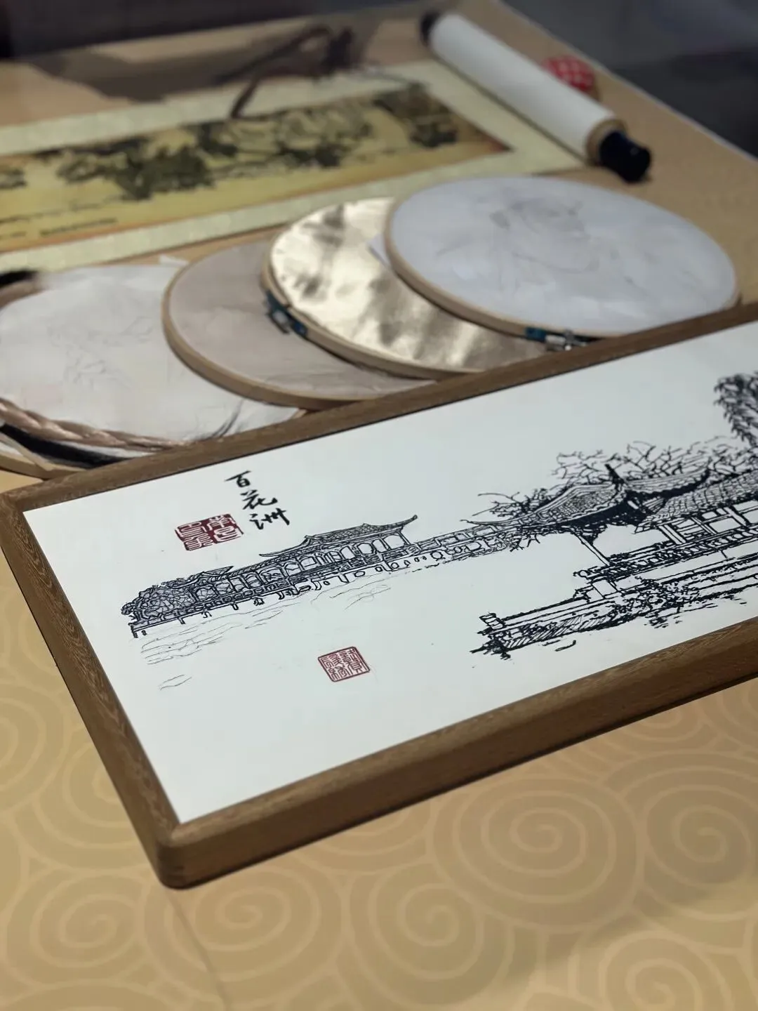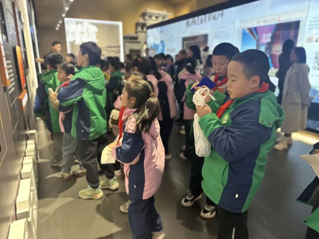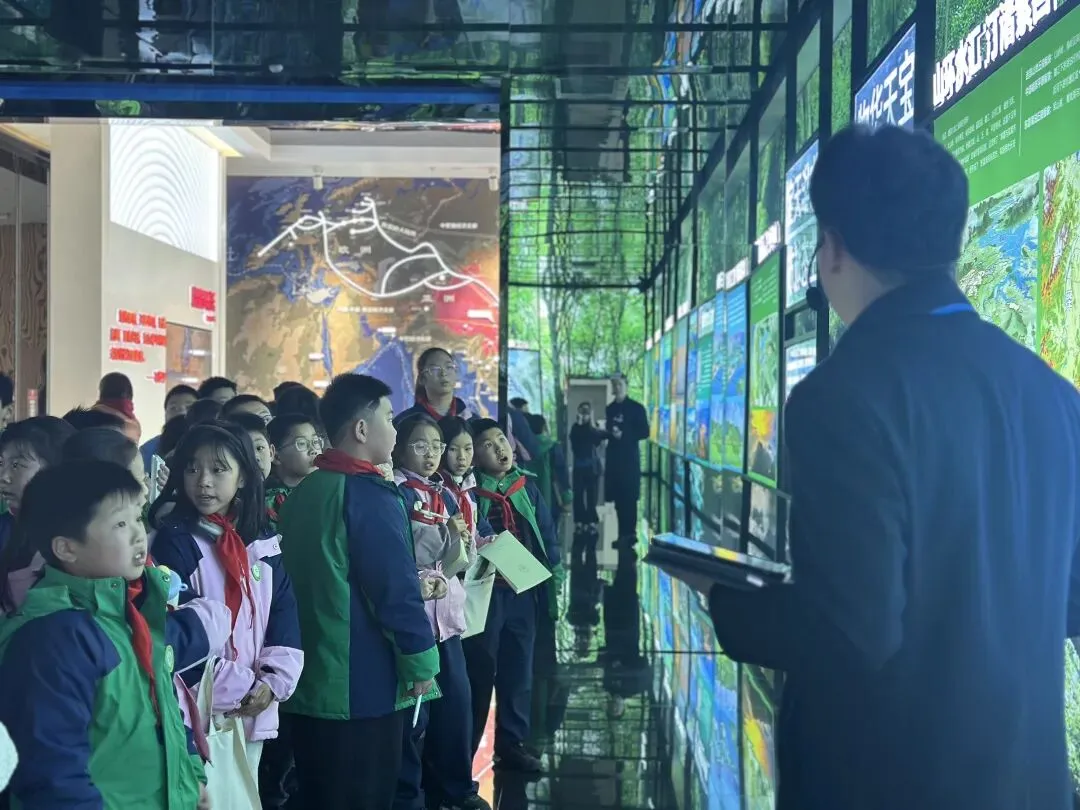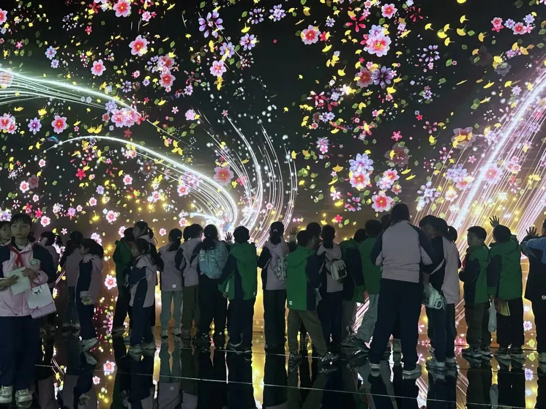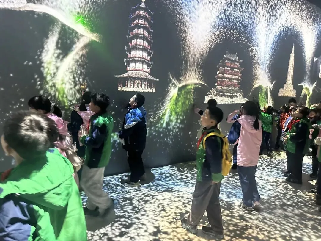 在山水厅,“一路赣水穿城过,百里依山入城来”的山水画卷通过平面展板展开。作为“中国水都”,南昌丰富的湿地资源让同学们赞叹不已。花鸟瀑布展项前,大家走进互动水幕,指尖划过便切换出南昌四季花卉,不同触碰力度还能开出大小各异的花,沉浸式感受生态之美。同学们一边听讲解,一边快速记录家乡生态优势。