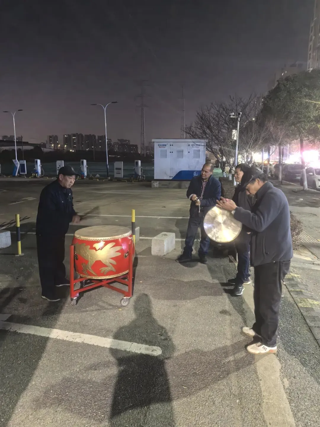 华灯初上,北沥的停车场褪去白日的车水马龙,成了德胜鼓队的“临时舞台”。没有华丽的舞台灯光,只有路灯的暖光洒在红漆大鼓上;没有专业的演出服,只有徐氏宗亲们朴素的便装,可当徐普然的鼓槌率先落下,厚重的鼓点便像有了生命,徐金龙的铙钹清脆相和,徐六根的铜锣沉稳跟进,三人配合默契,每一次鼓点的起落,都带着北沥人骨子里的豪爽与热情。