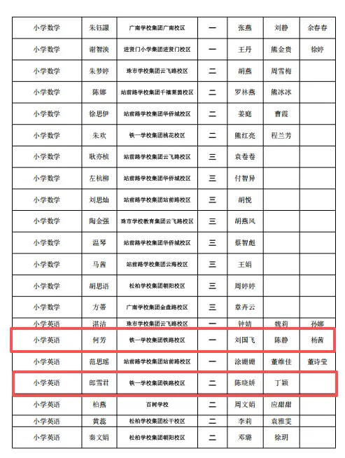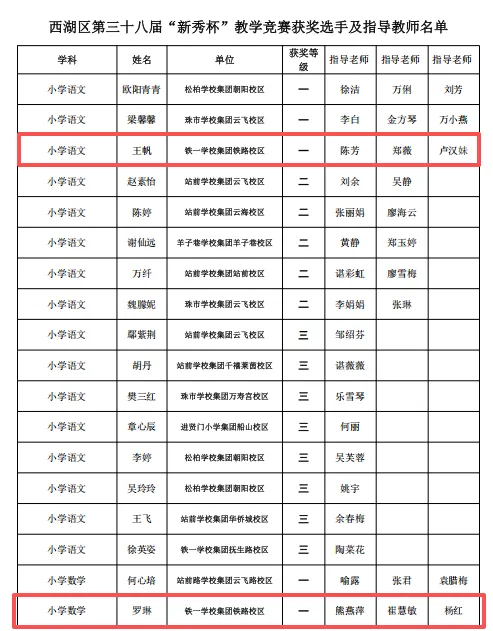 本届竞赛覆盖小学至初中多个学科领域,铁路校区教师踊跃参与、精心筹备,在赛场中尽显教学风采。其中,王帆老师(小学语文)、罗琳老师(小学数学)、何芳老师(小学英语)凭借扎实的教学功底、灵动的课堂互动与高效的育人成效,荣获一等奖;郎雪君老师(小学英语)以严谨的教学逻辑、生动的课堂呈现,斩获二等奖。