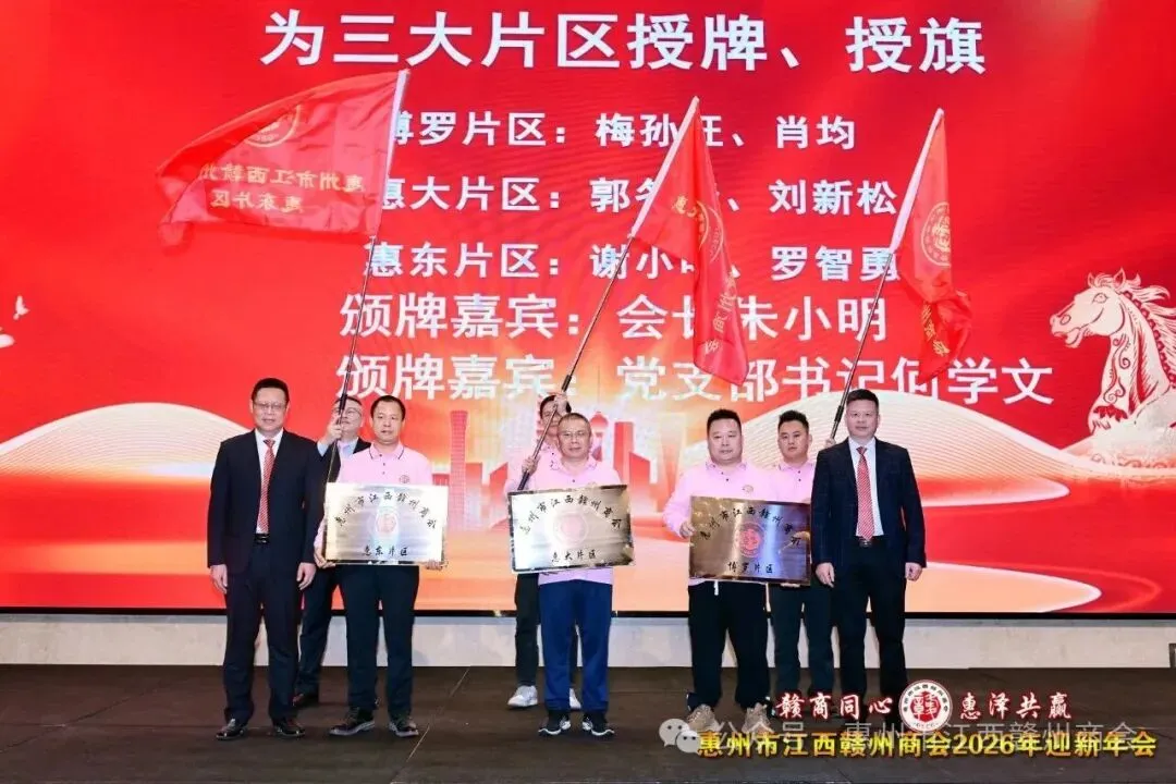 年会上举行了隆重的授旗授牌仪式。为进一步优化服务布局,赣州商会正式设立博罗、惠大、惠东三大片区。会长朱小明,党支部书记、监事长何学文分别为三大片区代表颁牌授旗,标志着商会服务网络进一步完善,将为商会片区联动发展注入强劲动力。