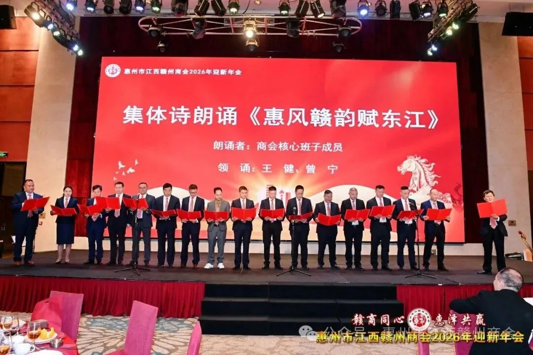 晚会环节的节目表演更是精彩纷呈。商会班子成员集体诗朗诵《惠风赣韵赋东江》,诗中以客家根脉连系与红色基因传承,串联起惠州商会2025年在党建引领、规范运作、精准服务、乡情凝聚上留下的坚实足迹,抒发了赣商“厚德实干、义利天下”的初心与“逐梦湾区、共赢未来”的壮志,深情表达了在惠赣商对故乡的眷念和对第二故乡惠州的热爱,展现了新时代赣商的文化底蕴和精神风貌。当朗诵接近尾声,一句“情系赣南,梦圆东江,惠州赣商,粤赣越强!”的口号引发全体会员的共鸣,台下会员纷纷起立,高声应和,铿锵有力的呐喊响彻全场,尽显赣商同心同向的磅礴气势,振奋人心。