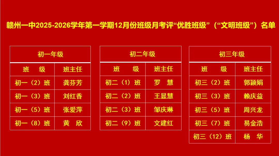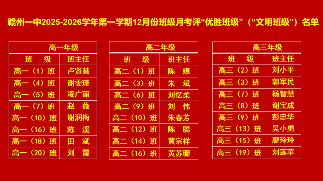 赣州一中2025-2026学年第一学期12月份班级月考评 “优胜班级”(“文明班级”)名单