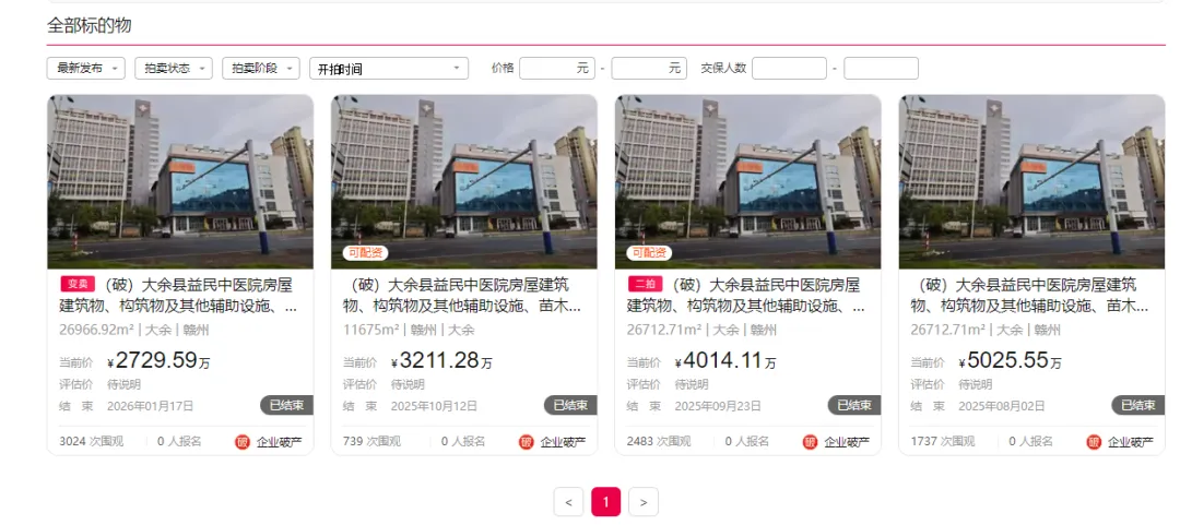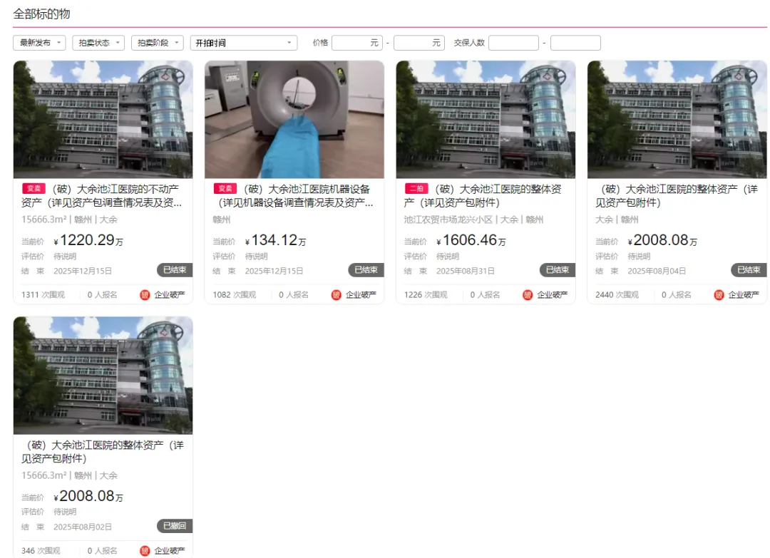 近日,大余县多家医院资产在阿里资产拍卖平台上进行破产变卖。