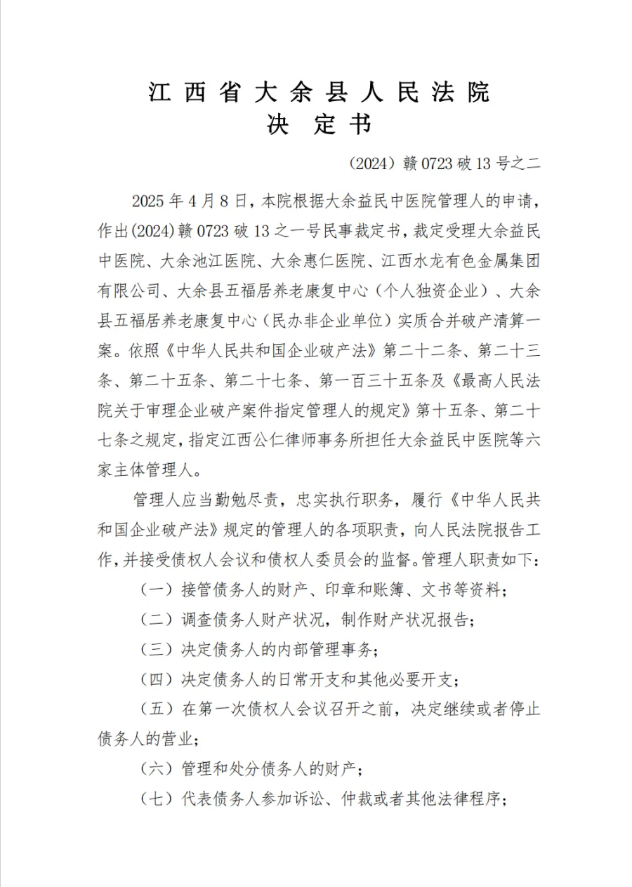 2025年4月8日,该院裁定受理大余益民中医院、大余池江医院、大余惠仁医院、江西水龙有色金属集团有限公司、大余县五福居养老康复中心(个人独资企业)、大余县五福居养老康复中心(民办非企业单位)实质合并破产清算一案,并指定江西公仁律师事务所担任大余益民中医院等六家主体管理人。