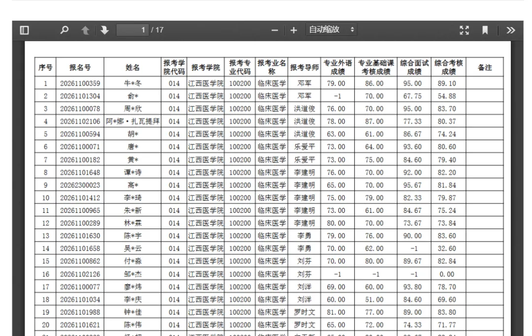 2026年南昌大学江西医学院临床医学博士研究生(普通招考、硕博连读) 综合考核成绩公示(第一批)