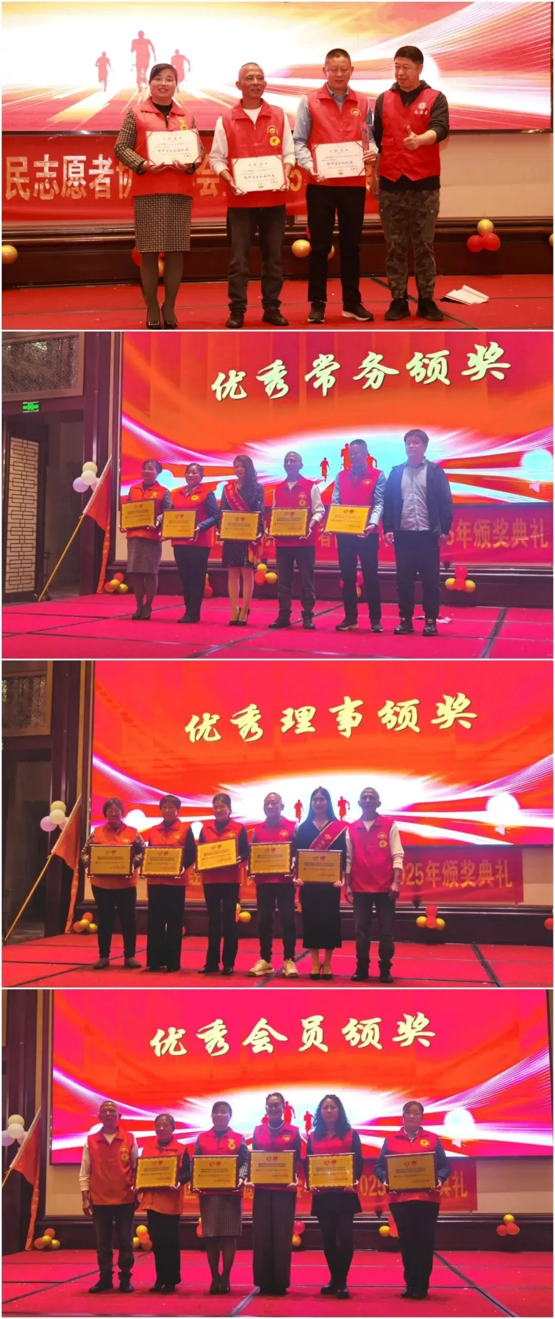 表彰环节成为晚会核心亮点,多项荣誉逐一揭晓。“优秀突出者奖”“优秀组织者奖”“优秀常务理事”“优秀志愿者”奖等依次颁发,安雪峰科长、龙腾组长等嘉宾与胡庭育会长为获奖者颁奖,每一份荣誉都承载着对志愿者无私奉献的肯定。
