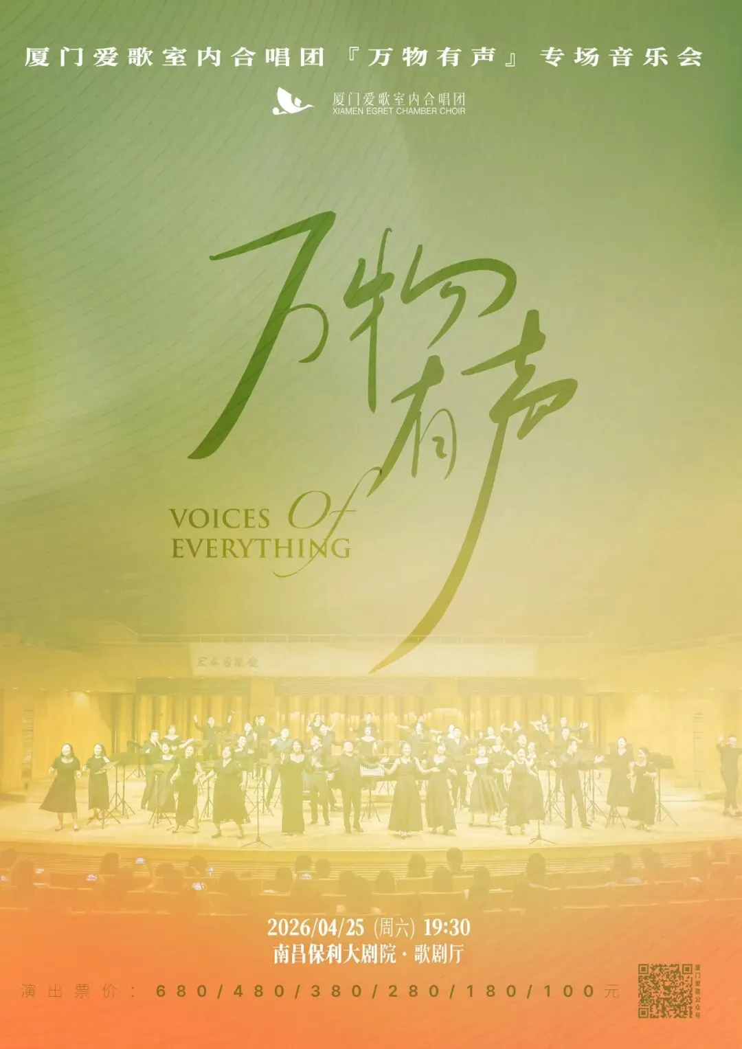 厦门爱歌室内合唱团带着场场爆满、全网热议的“治愈和声”,即将登陆英雄城!继2025年巡演全网售罄,2026年1月重庆、成都站座无虚席,2月厦门站加场仍一票难求后,4月25日『万物有声』专场音乐会南昌站,于今日11:00正式开票!厦门爱歌邀您共赴一场关于声音的情感盛宴!