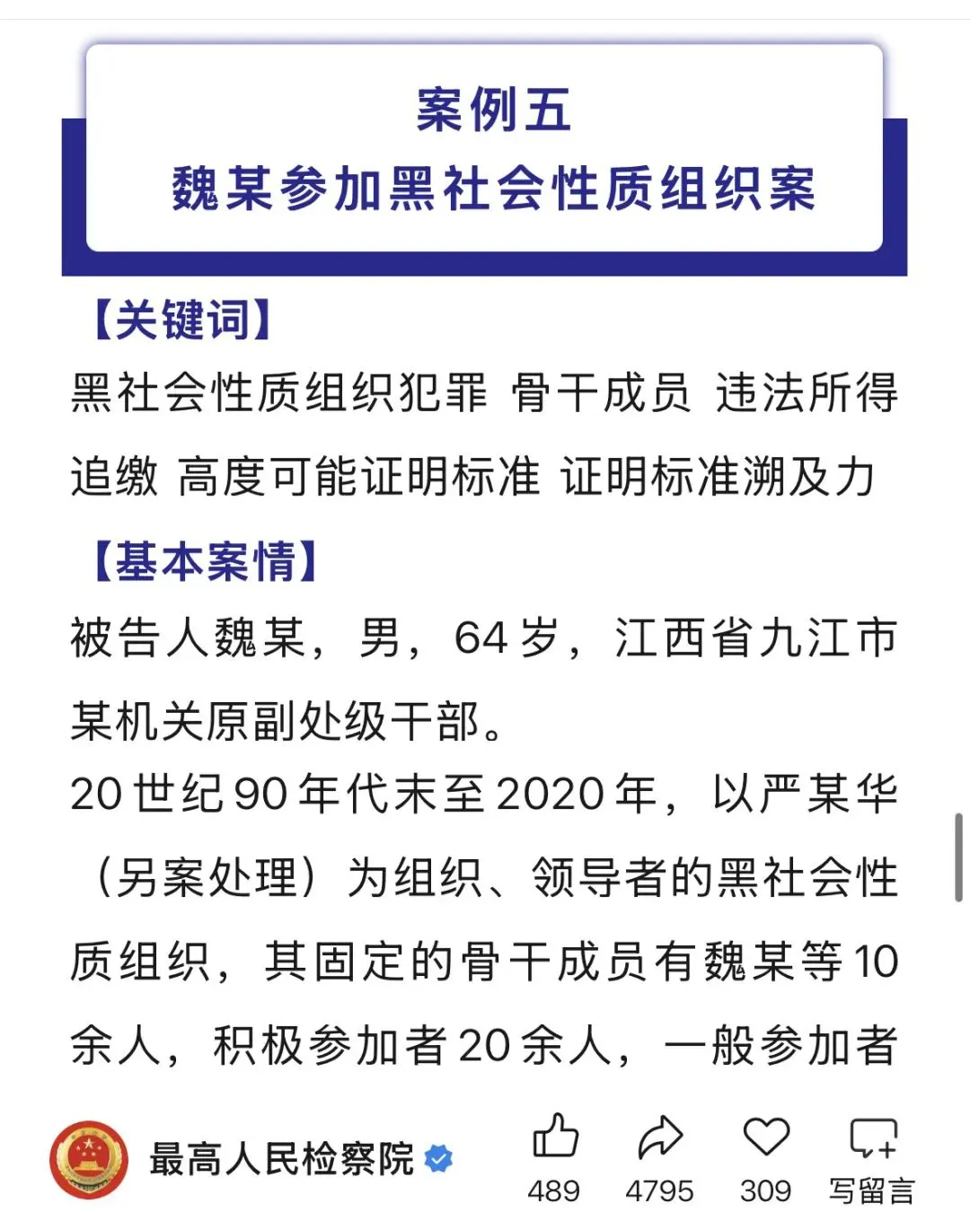扎实推动常态化扫黑除恶斗争落地见效,在办理魏某参加黑社会性质组织案中,准确甄别、依法处置涉黑财产,入选全国检察机关开展常态化扫黑除恶斗争典型案例。