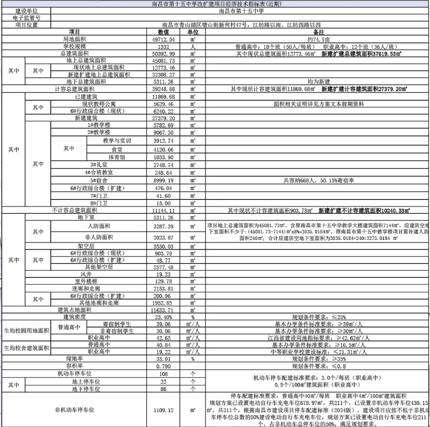 1月12日南昌市第十五中学改扩建项目规划、建筑设计方案批后公布。学校位于青山湖区塘山街新何村47号,江纺路以南、江纺西路以西,用地面积约74.5亩,总建筑面积50392.99㎡(其中现状总建筑面积12773.46㎡,新建扩建总建筑面积273.79.2㎡),规划普通高中18个班(50人/班)、职业高中12个班(36人/班)。