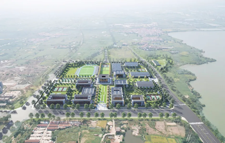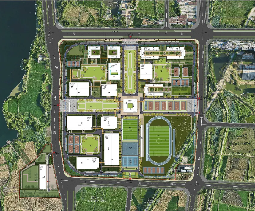 地块内建筑均为新建,主要建设内容共包括两栋四层的教学楼、三栋五层的学生宿舍、一栋两层的食堂、一栋两层的办公楼、一栋四层的图书馆、一栋三层的重竞技馆、一栋一层篮球馆、一栋一层羽毛球馆、一栋两层的乒乓球馆、一栋一层的游泳馆、一栋一层的室内田径馆、一栋一层的船库、地下车库及设备房、门卫、大门、风雨连廊、看台、室外运动场地(400米环形跑道运动场),道路,围墙等配套设施。