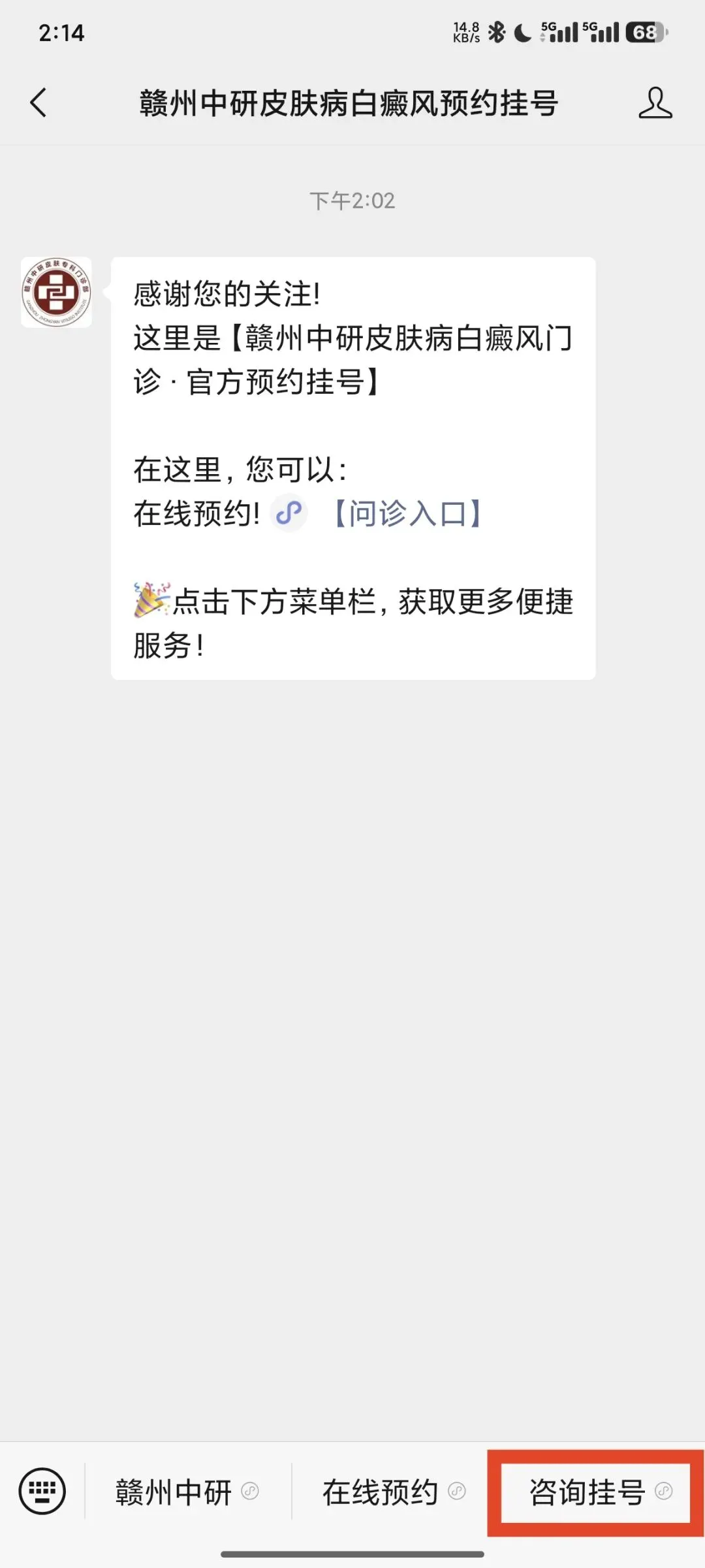 别发愁!赣州中研白癜风医院 「极速挂号通道」强势来袭,一站式破解就医困局!微信搜索【赣州中研皮肤病白癜风预约挂号】公众号,点击底部菜单栏【预约挂号】,即刻进入名医资源库,随心选择经验丰富的专家团队,灵活安排就诊时间,三步搞定挂号!无需在医院苦等,节省时间成本,畅享便捷优质的医疗体验。