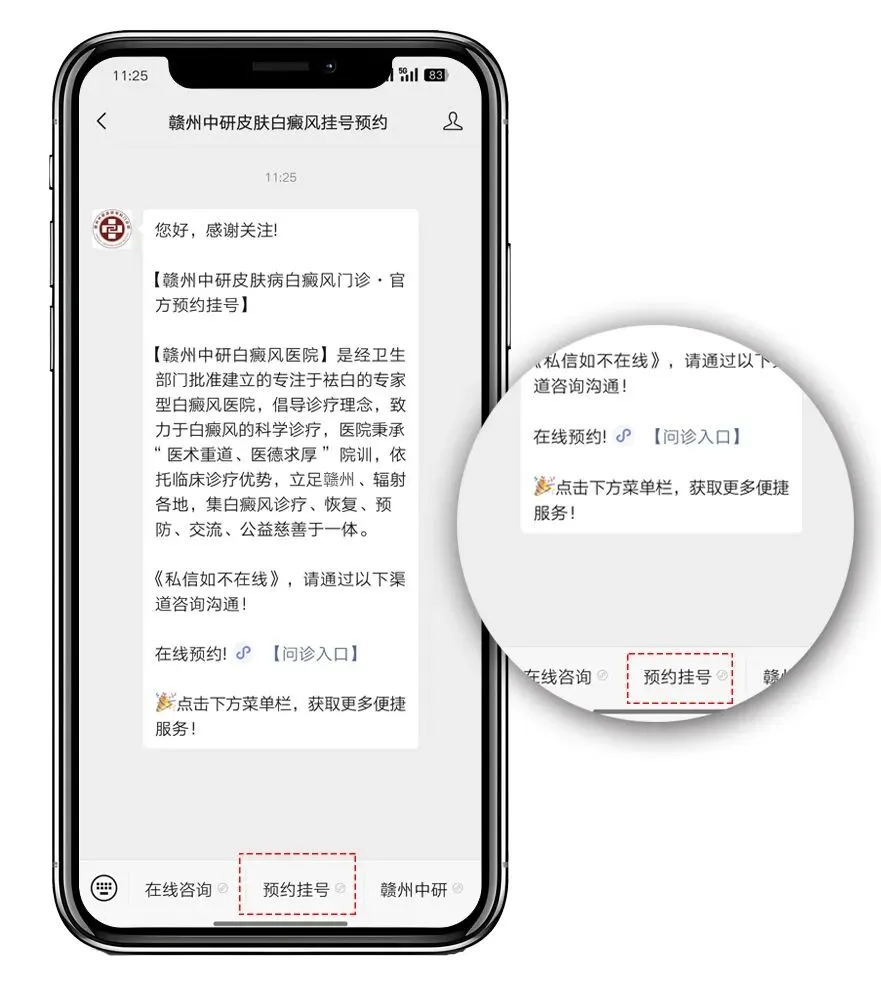 “赣州中研白癜风医院挂号”公众平台回复关键词,如:白癜风、皮肤白斑、白点等白癜风疾病词,可获得相关科普介绍!