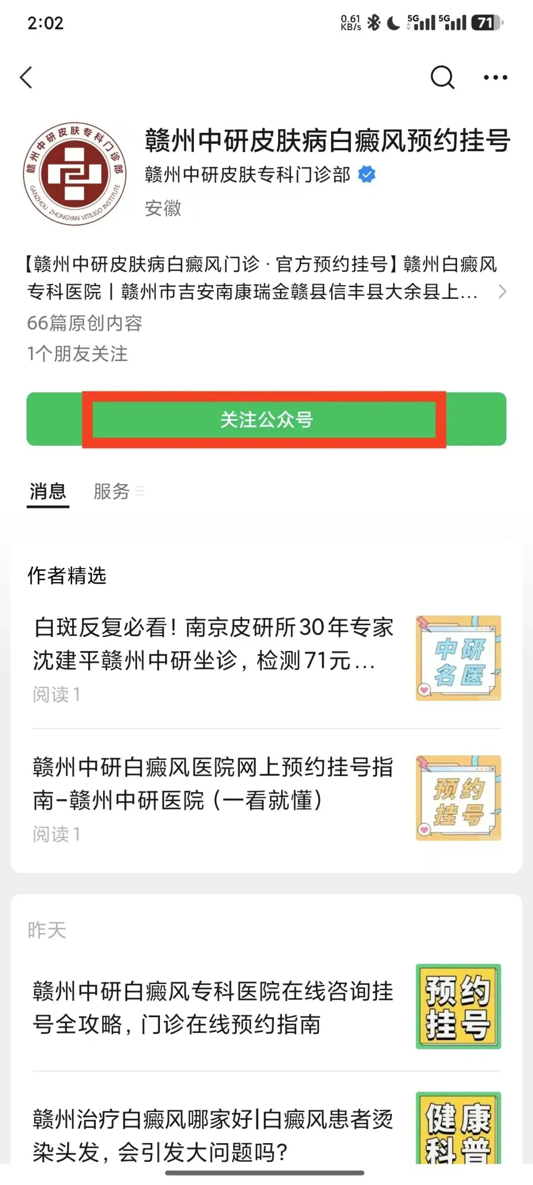 别愁!赣州中研白癜风医院重磅开启 「秒速预约通道」,直击就医痛点,一站式解决挂号难题!只需打开微信,搜索「赣州中研皮肤病白癜风预约挂号」公众号,点击底部菜单栏【预约挂号】,海量专家资源即刻触达。您可自由选择临床经验丰富的名医,灵活选定就诊时间,仅需三个简单步骤,就能完成挂号!全程线上操作,无需在医院苦等,高效又省心,助您畅享便捷优质的医疗服务新体验。