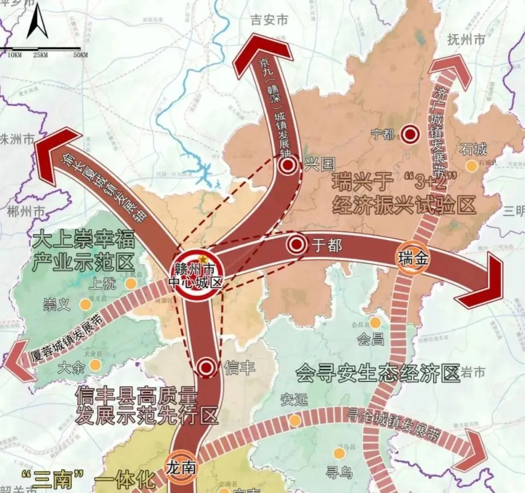 这种“偏心”,在规划文件里有个正式说法,叫“一核引领、三区协同、县域联动”。 听上去挺平衡,但核心就一个:中心城区五区(章贡、南康、赣县、经开、蓉江)是绝对的主角,是必须做强的“发动机”。