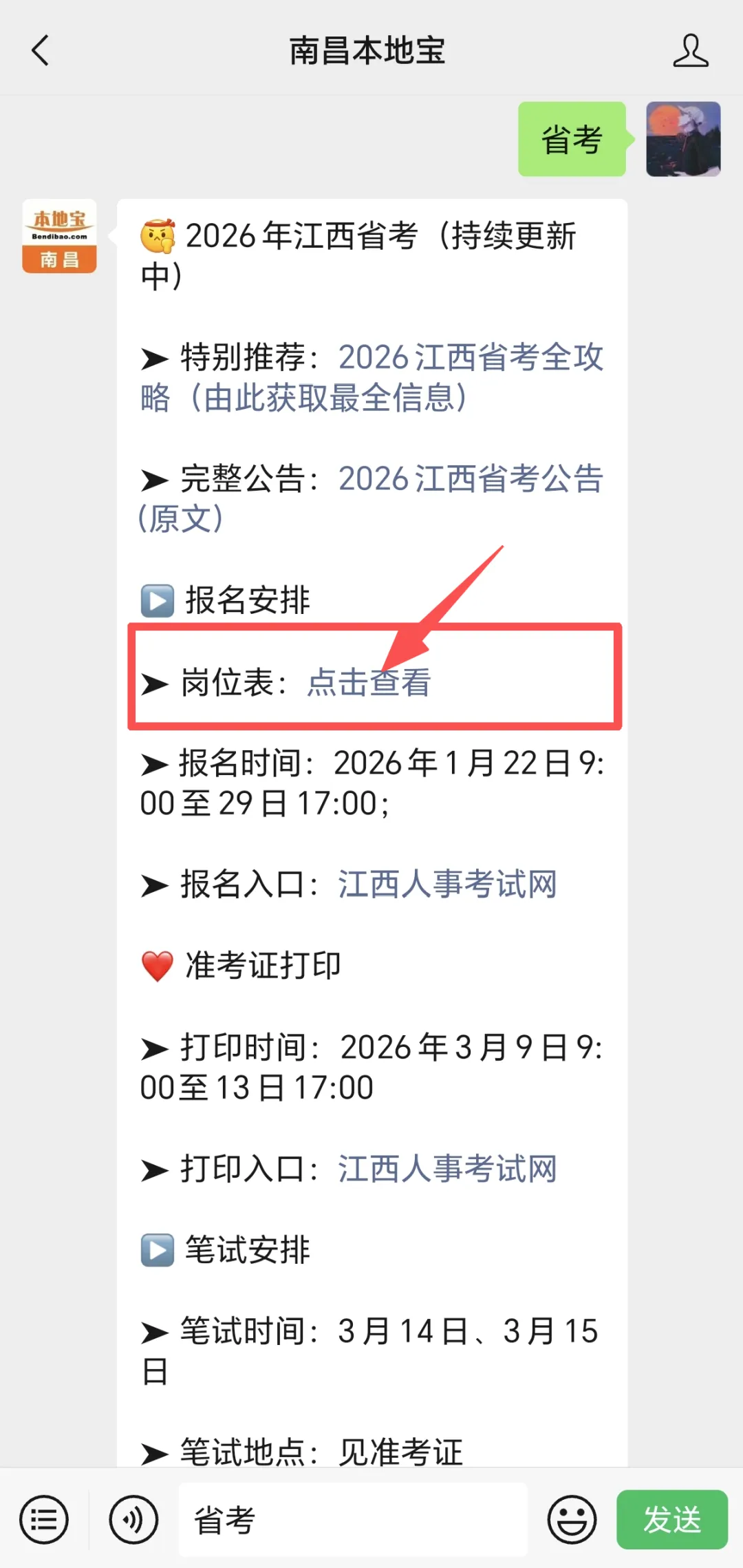 南昌本地宝推出非常多的功能,进入【南昌本地宝】公众号聊天对话框里,点击发消息,在对话框内输入并发送对应的【关键词】即可获取相关内容。