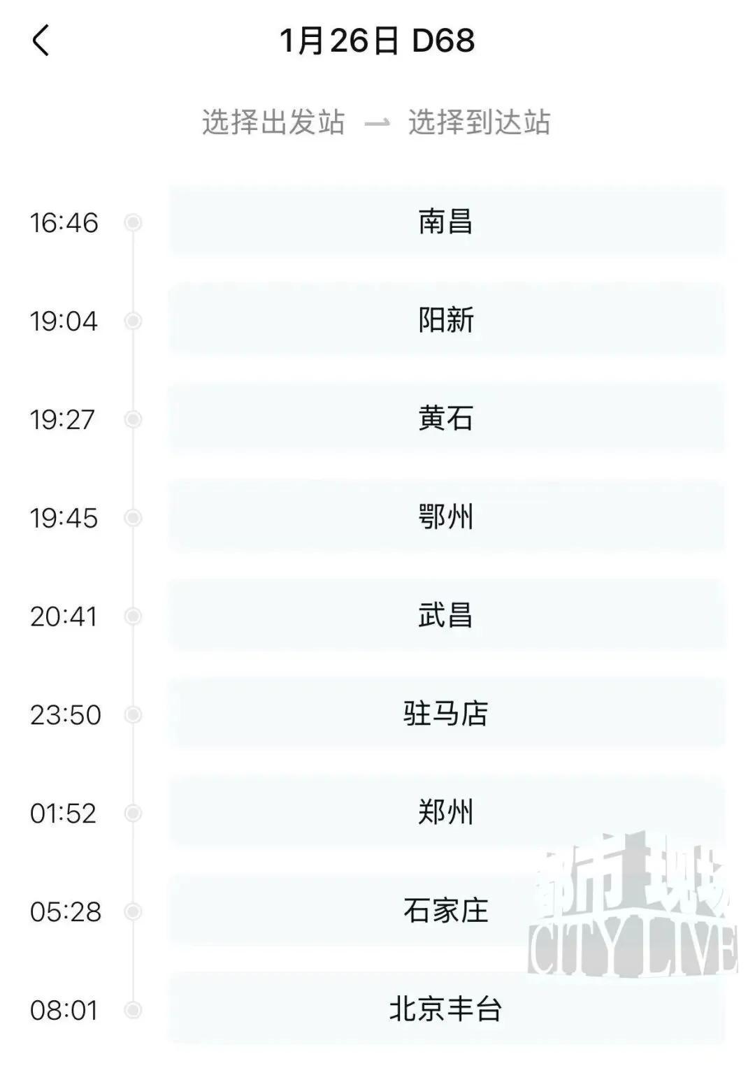 据高铁管家查询显示,D68将于1月26日16:46从南昌站始发,途经阳新、黄石、鄂州、武昌、驻马店、郑州、石家庄、北京丰台。