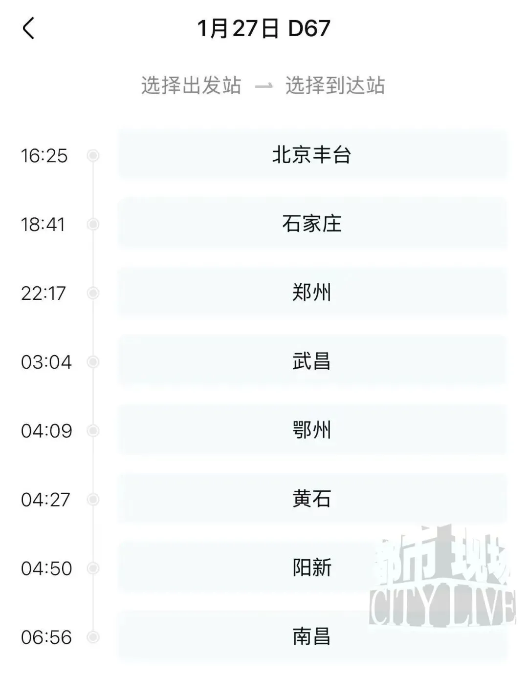 D67将于1月27日16:25从北京丰台始发,途经石家庄、郑州、武昌、鄂州、黄石、阳新、南昌。