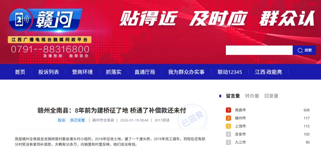 我是赣州全南县金龙镇岗背村委会渡头村小组的,2018年征收土地,建了一个渡头桥,2019年完工通车,到现在还有部分村民没有拿到补偿款,大概有30多万,向镇里和村里反映,他们说没有钱。江西广播电视台都市频道第一时间将这位网友反映的问题转交给全南县委宣传部